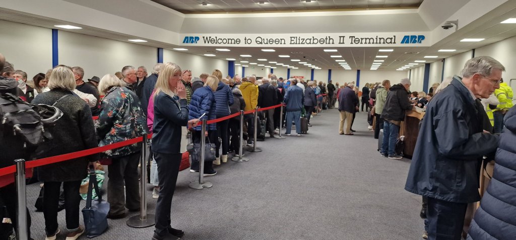 This morning was bright and sunny, but with a definite “nip in the air.”  But, like a light switch, that cloudless sky switched to “fifty shades of grey,” and the heavens opened as we walked around in search of a coffee and some last-minute bits and pieces. Boarding was not until 14.45 hrs, and as long as I was there before 16.00 hrs, there was plenty of time to relax and make any last-minute necessary purchases, as well as a light lunch.