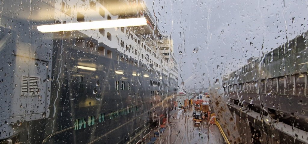 Don’t be fooled by the title of today’s blog; I am having a great time!  Queen Mary 2 is ploughing through a severe gale (force 9),  and my cabin looks straight out on to the mountainous frothy waves outside.   One such wave crashed against my window with a frightening thud!  At home, for some reason, I had forgotten about the joyous and exhilarating sensation of being tossed around in high seas, beneath menacing grey skies, in the pouring rain.  So beginneth the QM2 Centenary World Voyage, and so far, the atmosphere on board is generally one of contentment.