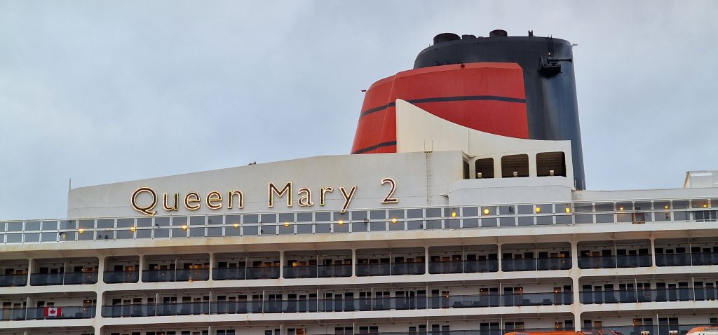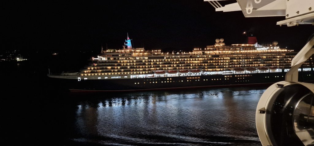 Queen Mary 2 taken from Queen Victoria as she passes the Flagship still docked at the Queen Elizabeth 11 Terminal.  (Credit Ronda)