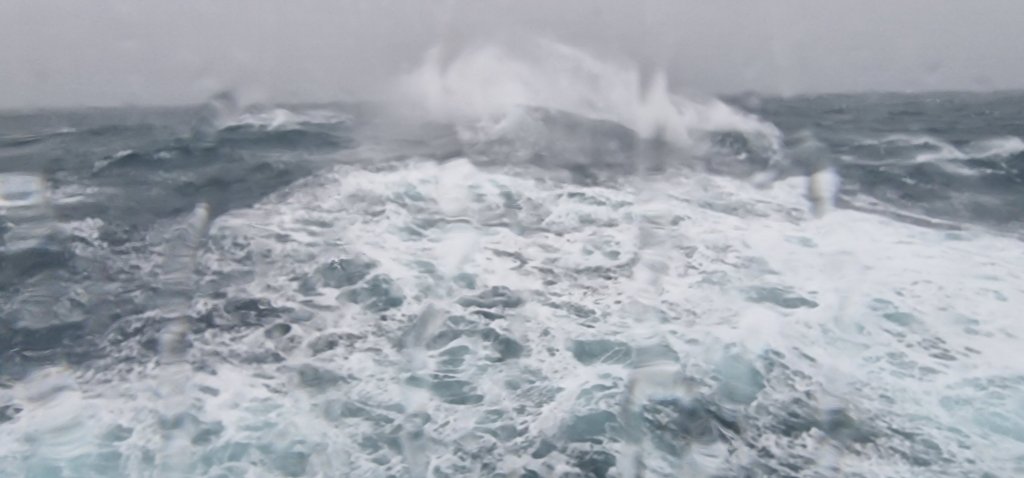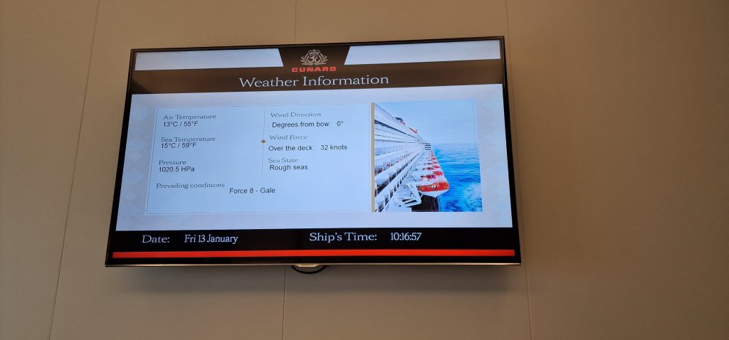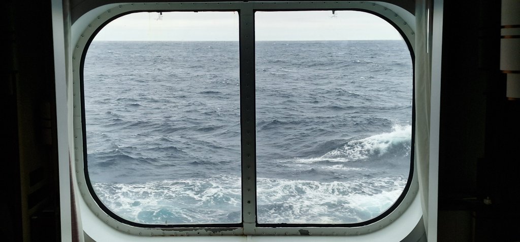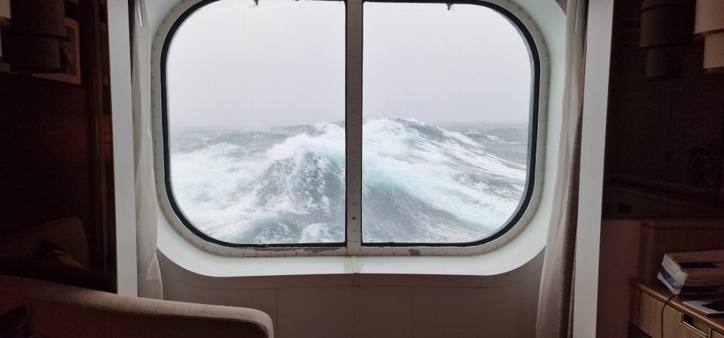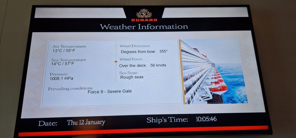 Tonight’s Weather Information still indicates severe gales, force 9. We are steaming at 19.6 knots in rough seas. Winds over the deck are 40 – 43 knots, and still, passengers are not allowed out!