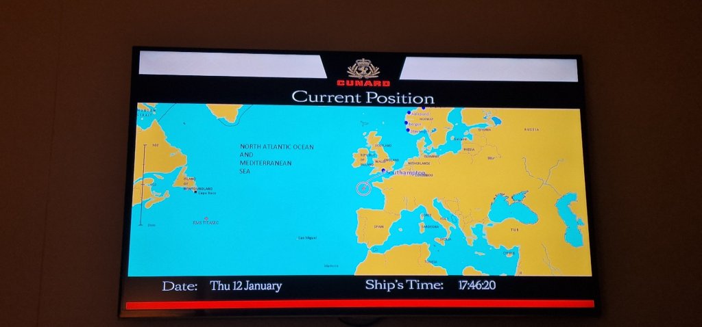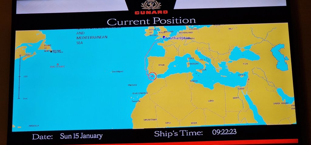 Yesterday, the first full day, at sea, was one of generally re-becoming acquainted with my, by now, familiar surroundings on board QM2. For a second time, Jo and I dined in the Piazza part of the Kings Court buffet, where the food is prepared from scratch and deliciously hot.  Quite how the conversation turned to striking workers (particularly train drivers) came about, I fail to understand.  But I had to make it quite clear that I was retired and on holiday!  At long last, I felt as if my dodgy stomach was freed from the effects of eating something dodgy last week.
