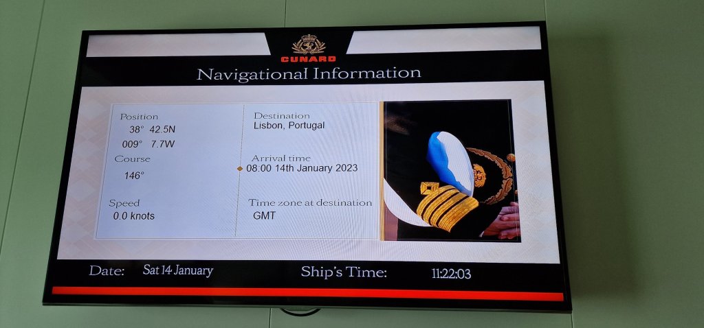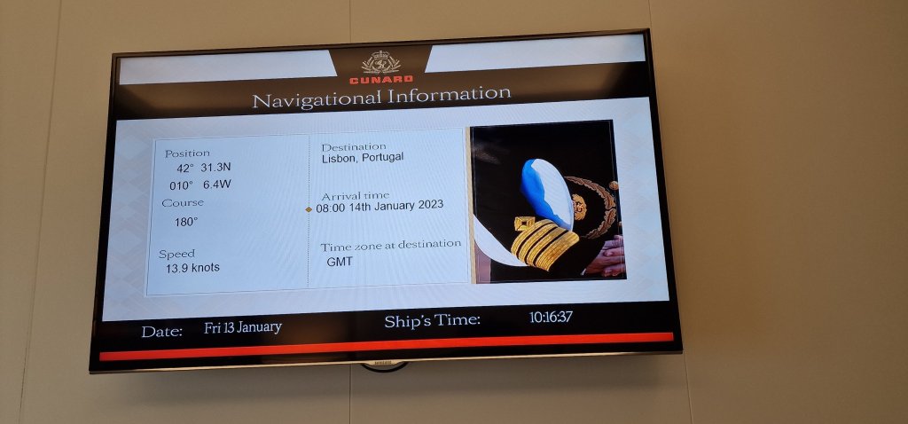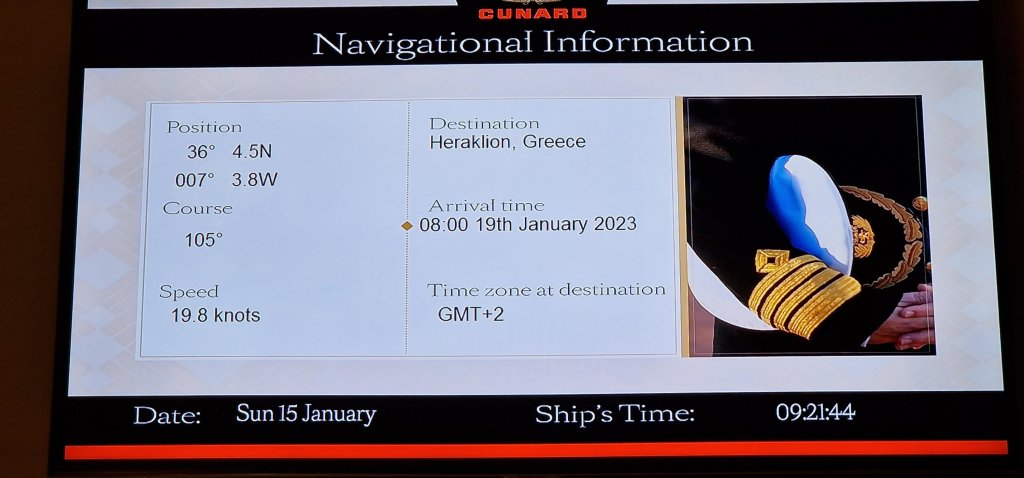 I must remember not to drink two medium-sized cups of regular coffee in the late afternoon; once I had woken up just before 4am, that was it until sometime after 6.15.  This did provide an opportunity to finish my blog for Day 4/102, however. According to the Navigational Channel (which at 4 am was stuck on one page, the temperature was up to 16°C with a slight breeze (F3) and calm seas.  Below are the updated pages as we steam ever closer to the Straits of Gibraltar.