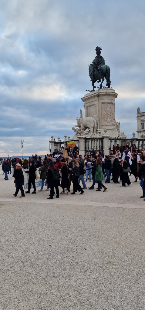 It seems the nationwide teachers’ protest has spread throughout the capital, right down to near the banks of the Tagus. Drums banging, hooters blowing, massive crowds shouting, singing, chanting, much noise of protest.