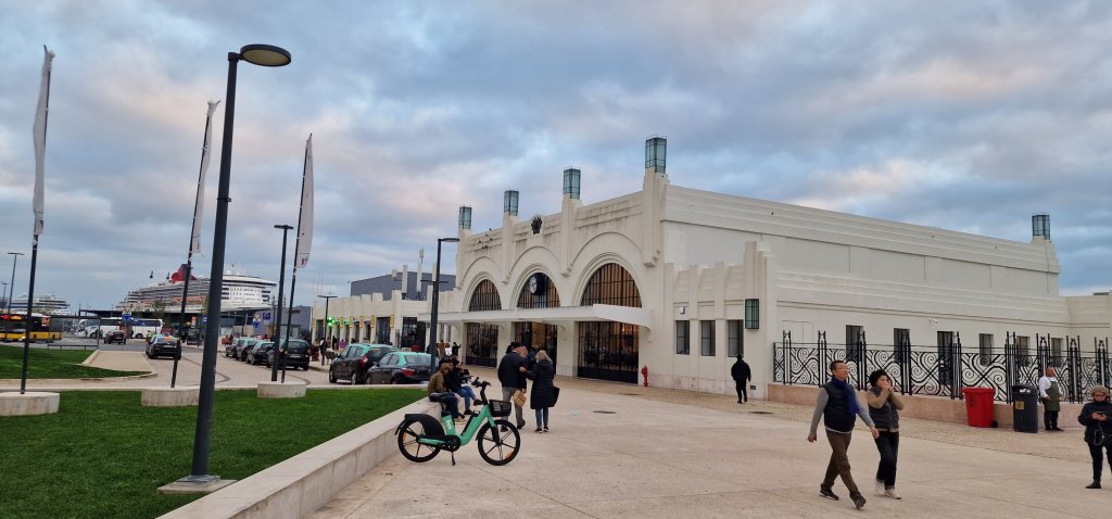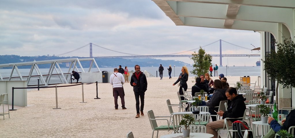 All might have been well if it wasn’t for an enormous national protest by the Portuguese teaching profession whom I understand had not received a pay rise for (I think) twenty years.  This snarled up the traffic system, and my bus seemingly abandoned the rest of its circuit without letting me know!  I don’t speak Portuguese. However, after some amateurish gestures on my part, I did find a taxi drivr, who, while not speaking English, whizzed me right back to where Queen Mary 2 was berthed, allowing me enormous relief!   An al fresco eatery nearby told me that their WC was for customers only.   Fair enough, I became a customer and enjoyed two coffees with a cheese and sausage sandwich.  Right now, there is time to stroll along the banks of the River Tagus.