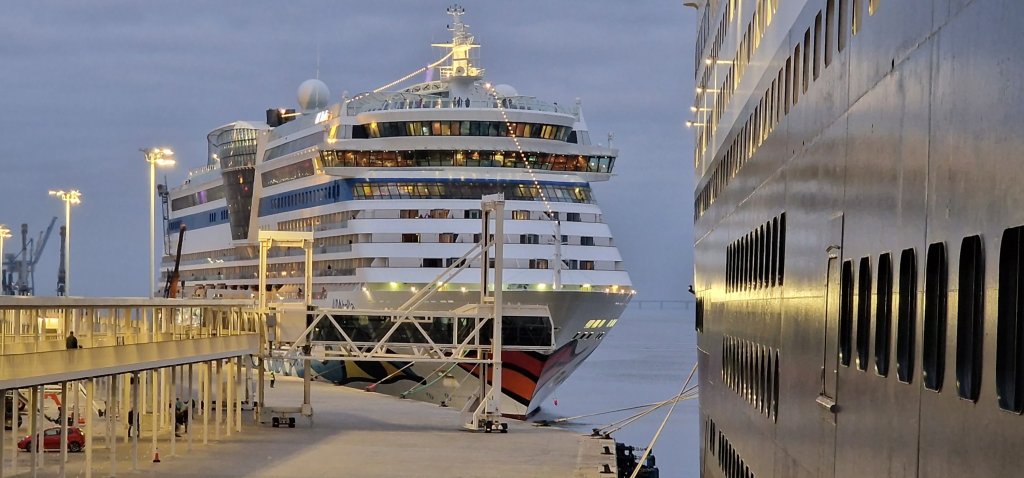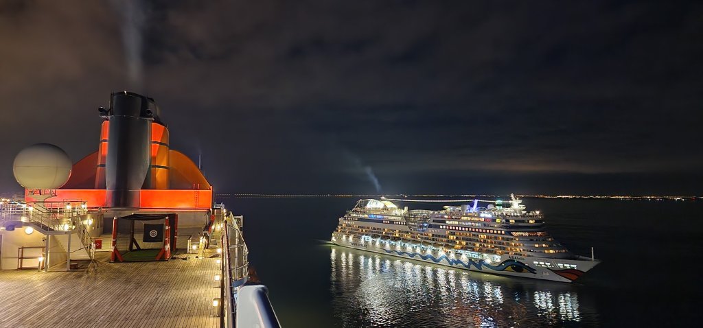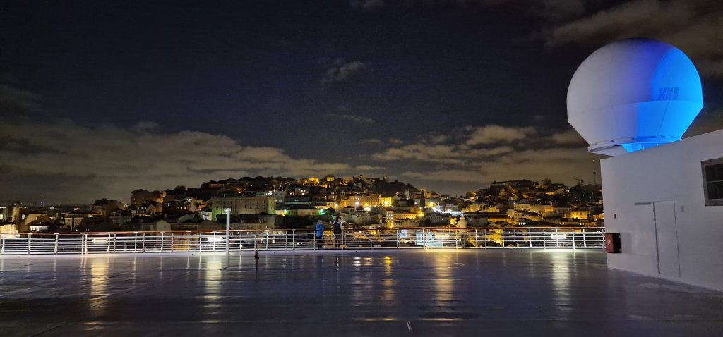 Once back on board, I made my way to Deck 13 for final twilight photographs of the Lisbon skyline, as well as watching the departing cruise ship AIDAbella sail past.