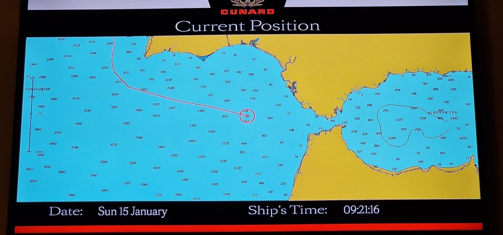 It must be improving outside. Cushions are on the deckchairs, with some already occupied. I am tired out from disturbed slumbers.  Time perhaps to maintain my 10,000 steps/day.  Last night, I was ahead of schedule.  We had sailed through the Straits of Gibraltar, passing the Rock of Gibraltar on the port side. Ken and Eileen (whom I met on the Coast Starlight Amtrak service from Los Angeles to, I think Emeryville, near San Francisco in 2019) joined us for lunch at my favourite table, which used to be always occupied by an important friend of mine, sadly no longer with us.  This made for a most enjoyable event, which seemed, at long last, to settling me down for the long haul. As ever, we were the last to leave the restaurant, but the waiting-on staff showed no signs of impatience.