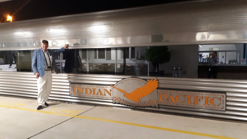 Now, I am settled in my much more roomy cabin. Train time has been retarded 90 minutes, making for a relaxing journey. Unlike The Ghan, there is but a half hour stop at Cook tomorrow. I bought a pile of memorabilia in the souvenir shop, including the last “Overland” baseball cap. Seemingly, that train is “hanging on in there”. We are on our way, now to Perth in Western Australia. And tomorrow, we spend the day crossing the Nullarbor Plains. I like that I can turn off the lights and see out at night.