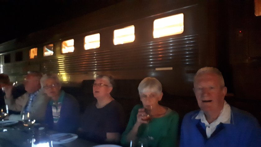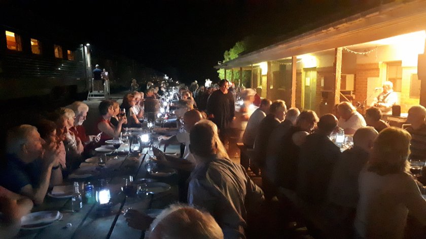 Passengers were seated at long rows of wooden picnic tables, lit by individual L.E.D. lights. It was all very atmospheric as the train’s resident entertainer serenaded the diners with popular songs on his guitar. He was received warmly and a couple of people danced to Waltzing Matilda, a slow and haunting interpretation. All too soon, we were back on the train and continuing our journey westwards. As far as I was concerned, a unique evening the memory of which I shall treasure.