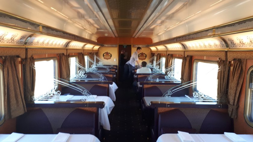 I will have to ascertain details from Adelaide, which is 2 nights, and the best part of 3 days. The guide book states a total of 29 carriages. On train staff tell me there are three units of four sleeping vehicles, one Outback Explorer Lounge Car, named after a famous pioneer, and The Queen Adelaide Restaurant. In addition, three further vehicles house Platinum guests in hotel style luxury, along with one composite dining and lounge car. Two power vans each generate 180 kVA, to service 14 cars with electricity. There are also staff sleeping quarters.