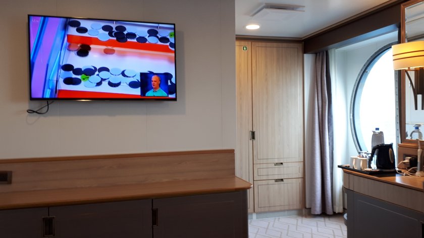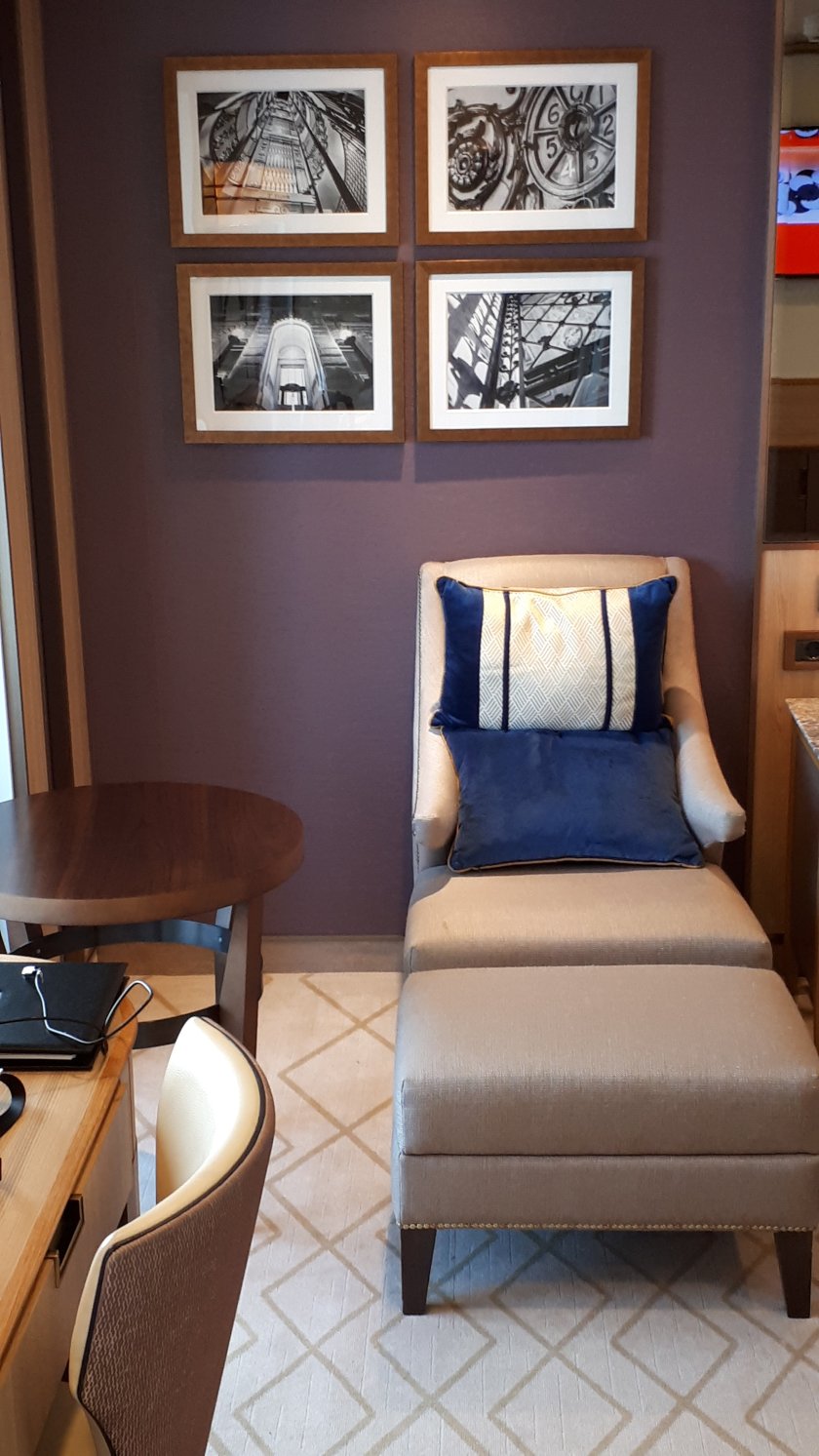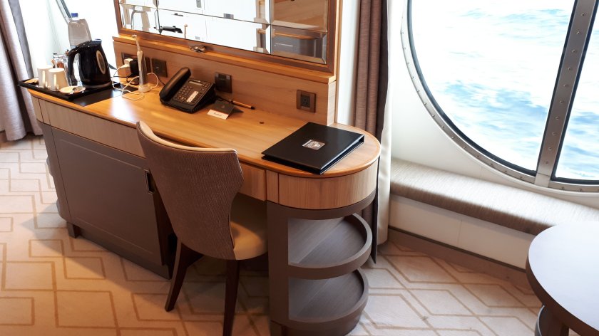 But, I was too late to whip up to deck 12 for an earful of QM2’s fog warning, pitched to be audible from 10 miles; the mist dispersed rapidly, leaving the most pleasant day as promised on channel 45 of the stateroom TV.I have not yet become tired of my single cabin. The brochure tells me it measures around 178 square feet. But not even the brochure photographs do this accommodation justice.