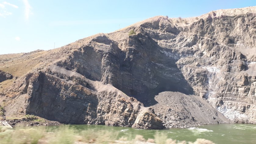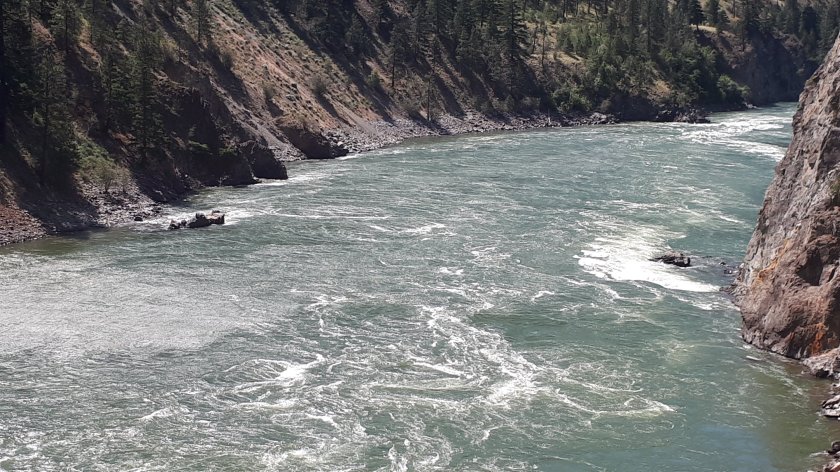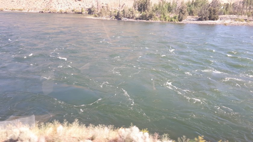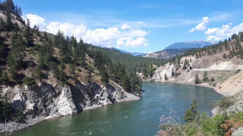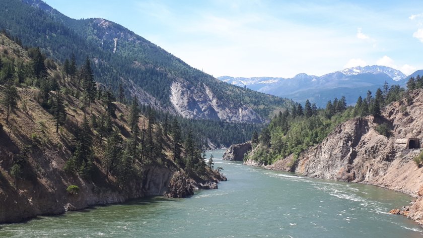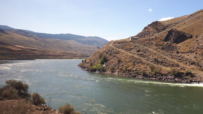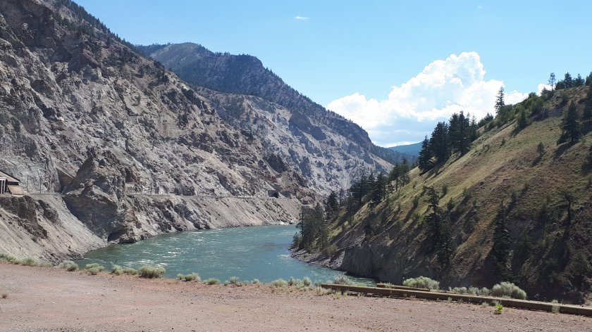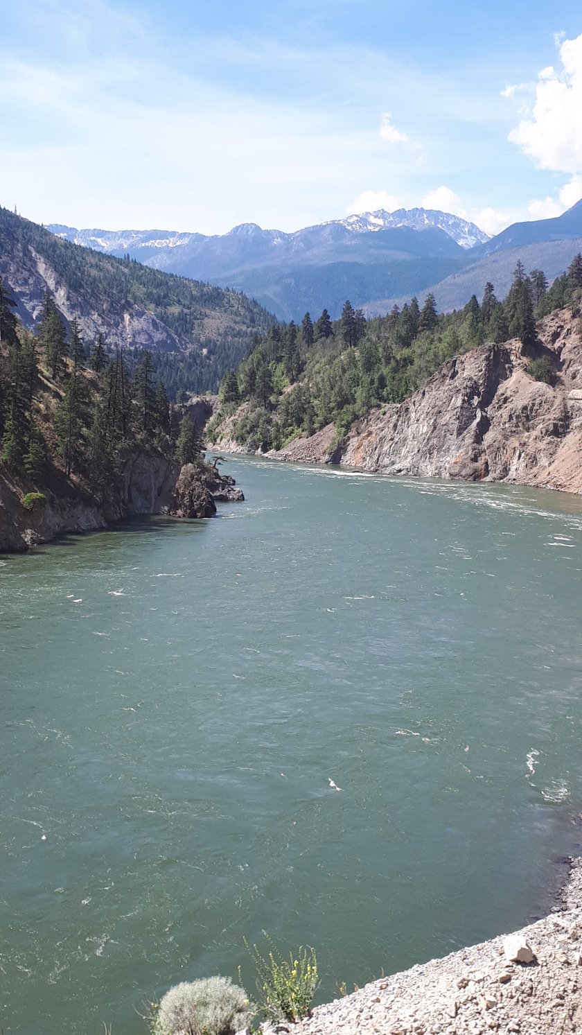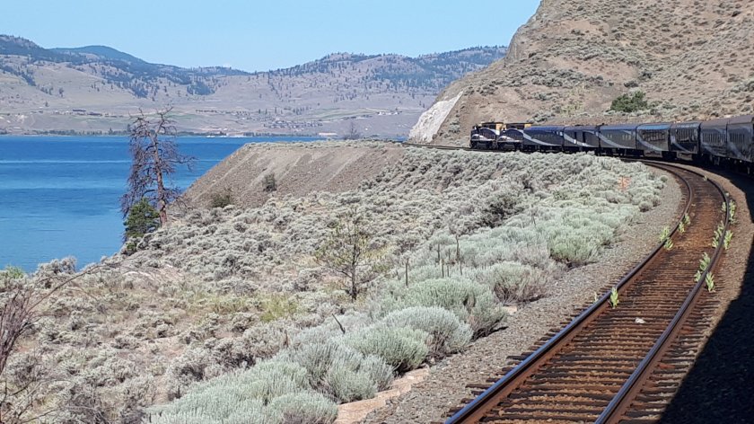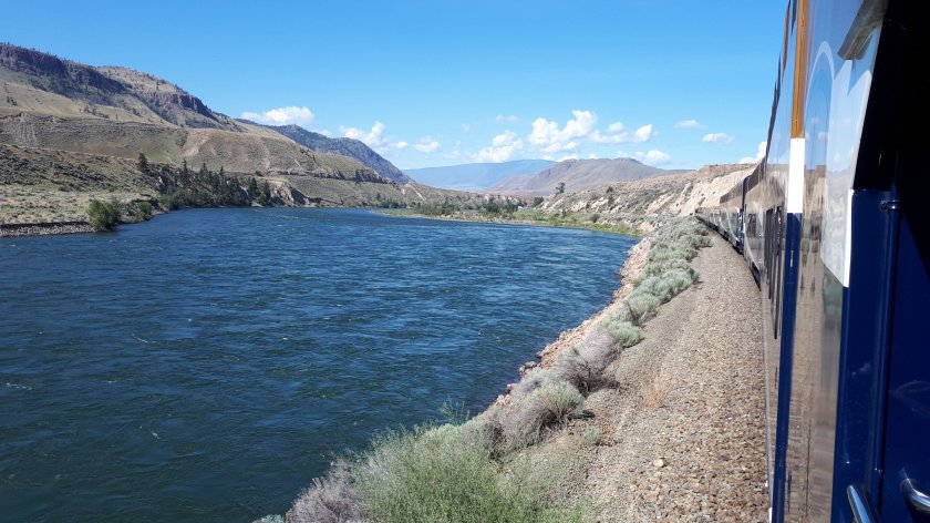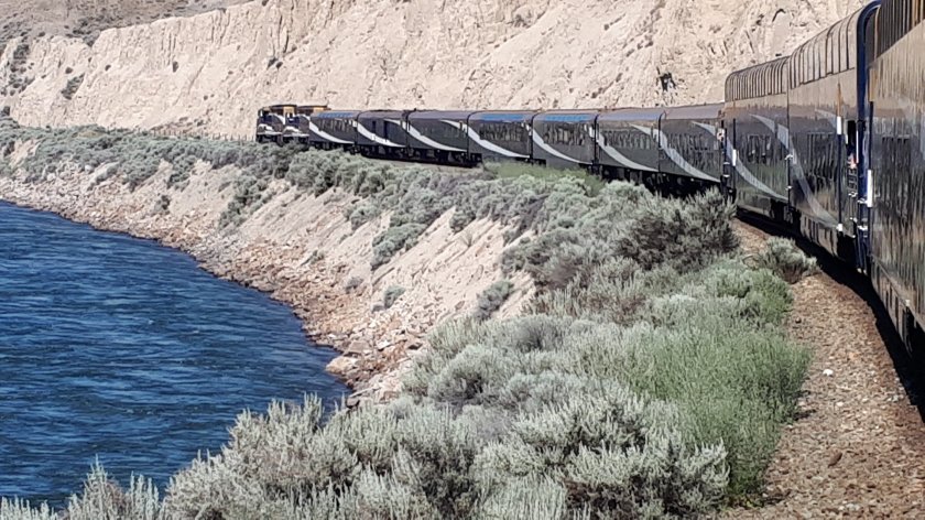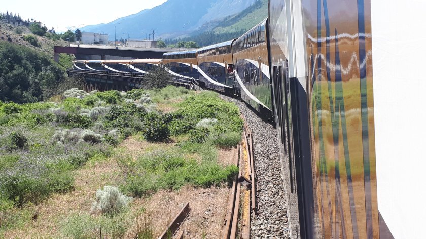 Coaches (mine was No.14) collected us from our hotel. The only disappointment on arrival at Kamloops “train” station was that the lovely new carriage we were in yesterday was, because of an electrical issue, unfit for public use. I did, however, end up at a right hand window seat affording an interrupted vista. The pictures I will enclose with this blog don’t quite portray the enormous scale of the landscape through which we are travelling. Today, The Rocky Mountaineer is now 23 vehicles in length (not including the locomotives) after the train from Banff was attached at Kamloops.