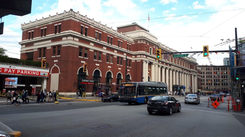I shall just have a second coffee so as to prolong “The Highlife” . Looking down at the vibrant city below, I find it almost unbelievable that I have, at last, crossed Canada by train, and that apart from perhaps a tourist flight, this very long journey involves no long distance flying. After lunch, I explored Gastown on foot, and watched as the steam clock chimed 4 o’clock. My camera battery had gone flat and I was too late, having shown up at the last minute, to capture this spectacle on my phone. I therefore took a Blue route bus for an alternative tour of the city. I returned to Gastown, with ample time to video this unique timepiece.