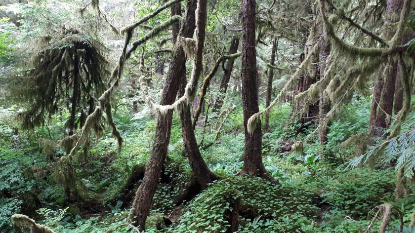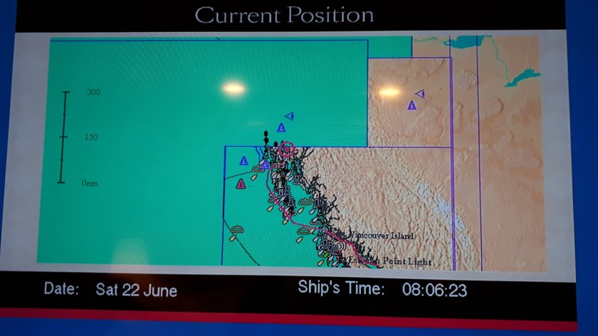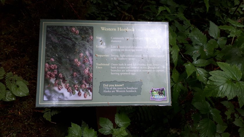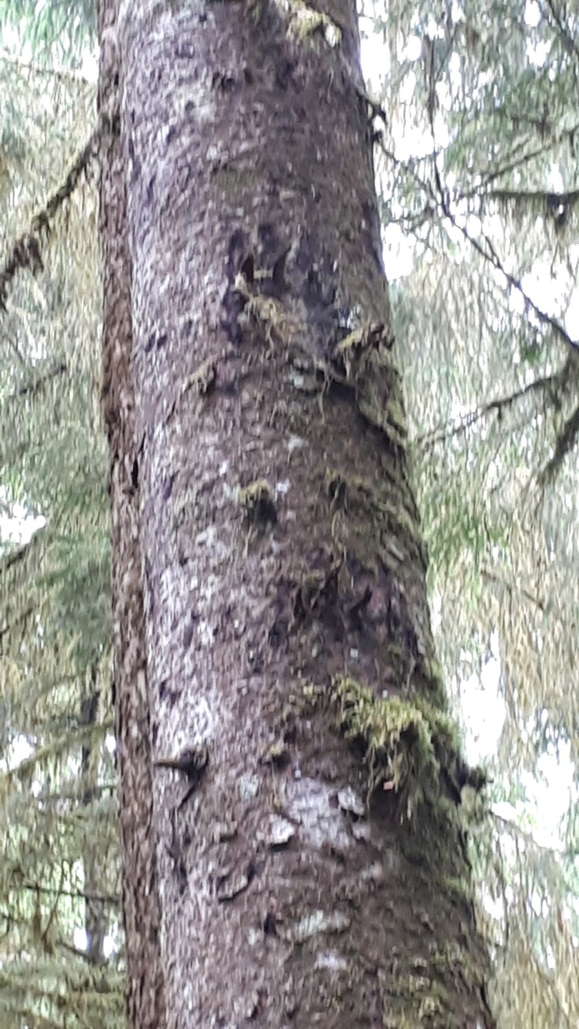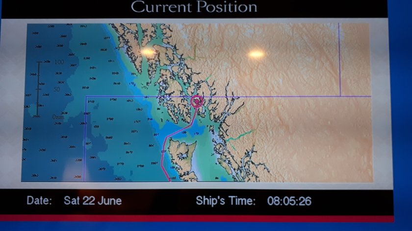 The first two pictures show the position of the Queen Elizabeth after docking at Ketchikan. The remainder are images captured from my cabin. Ketchikan has almost perpetual rainfall which the people and local environment rely on. Dry periods can soon have a marked impact on the welfare of the surrounding rain forest, which, according to our excellent guide, is second I in size, only to the Amazon. We travelled by bus for around 10 miles to a location where we were met by two guides who took equal sized guests into the rail forest. Our guide was knowledgeable and a superb communicator whose expertise gave us a very comprehensive account of almost everything we were seeing during a one mile stroll along a well prepared down-hill path. We did see eagles and my modest camera capabilities were most impressive capturing from a great distance, bald eagles, camouflaged in far away trees. We were later shown a huge totem pole under construction and then, were brought up close to fowel in the process of rehabilitation from predatory injury. The totem pole park was merely glanced at as time was running out. I’m sure we shall see plenty more on this most fascinating journey. Below, a handful of pictures taken this morning. Look carefully at the tree trunk with three parallel marks at intervals in the bark. These are the claw marks of young black bears escaping the clutches of predators.