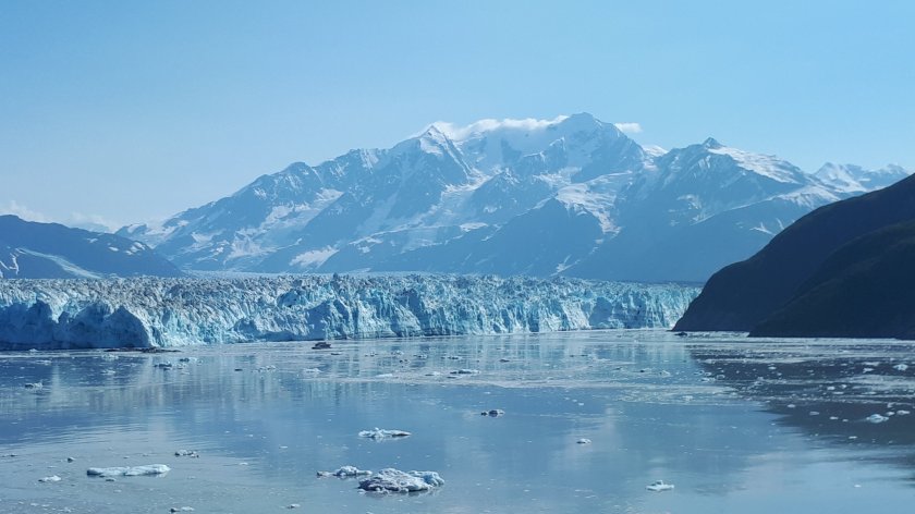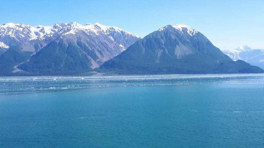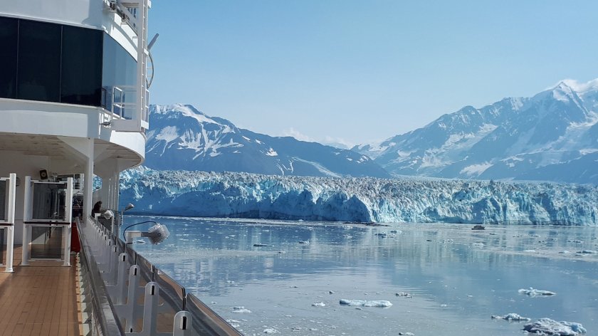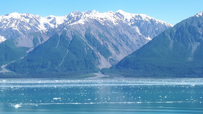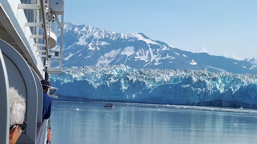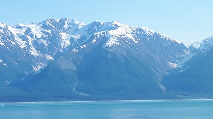 Today, the ship was scheduled to sail as close as practicable to Alaska’s Hubbard Glacier between 8am and noon. The forward crew area on Deck 5 had been opened for public viewing of the “mind-blowing” vista ahead. Again, the Almighty treated us to perfect clear weather conditions in which to admire His astonishing creation – or a very small part of it!A symphony of white and rock on the near horizon was a prelude to the “glorious oratorio of splendours to come.” Ice chippings over 400 years old littered the waters through which we were venturing. And like a frozen wave of utter fury, the Glacier revealed itself ever so slowly but prominently until all was spread before those eager observers occupying every suitable vantage point on the ship. I took both video and normal photographs and was very pleased that I had managed to capture footage of ice crashing into the water, creating an almighty roar as it broke away and fell from the front of the glacier. Was this a “wonder of the world?” My enthusiasm was quelled over lunch by a much travelled Australian lady at our table who proclaimed Greenland to be better still! All I can offer are the better pictures I managed from different locations on the ship.