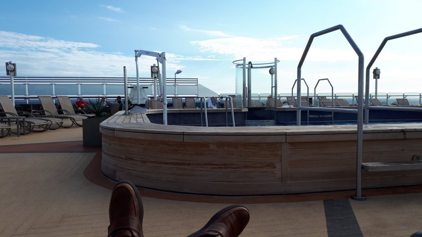 Although just past 7pm, it is still beautiful out on the open decks. My lily-white legs are not yet colour-coded with my face and arms!Deck walking has been spasmodic today, but so far, I have exceeded my “steps” target for the first 7 days of July.
