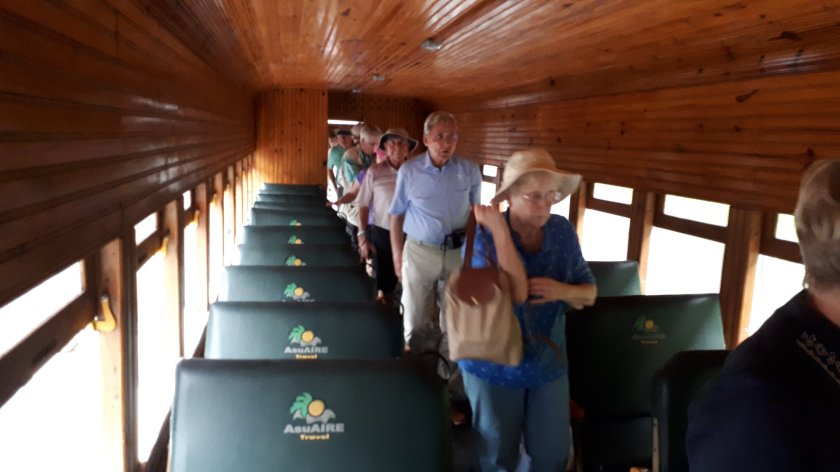 Again, we were made welcome, this time in the recently developed terminal of Puntarenas, Costa Rica. Having a hint of rail travel, I chose the Costa Rica Rail and River Ride, as very briefly described and illustrated yesterday. Firstly, (not in the order described in the brochure) we travelled by coach for over an hour, inland, past villages and other pockets of civilisation to the Tarcoles River for a 50 minute meander on a modern purpose built flat bottom motor boat. (Again see previous blog). The cruise brochure hinted strongly at, but went out of its way, not to guarantee, plenteous sightings of cormorants, pelicans, and frigates. A rare monkey appeared high in a tree, but was silhouetted against a bright sky and was hardly discernable. The brochure also urged guests to look out for “huge iguanas and lizards as well as herons, egrets and stalks in search of a bite to eat on the riverbanks.” Our knowledgeable and highly experienced tour guide warned us that much of the wildlife would be hard to discern using their camouflage capabilities as a defence against unwanted attention. With a laser torch, she pointed out seven tiny bats clinging to a tree branch, like black inverted triangles. And I saw a blue heron perched on a branch. It was explained that not being fully developed, the grey plumage would eventually become blue…what I had spotted was a young “blue heron.” No, as elsewhere on this holiday, wildlife was not in the great abundance the brochure suggested. And, being the rainy season, while on the river, the heavens opened to an almighty great crash of thunder. We returned to the coach and continued to the “mandatory” souvenir shop. There was a huge eclectic choice of souvenirs crafted, seemingly, by local artisans, many of which were quite beautiful and worthy of bringing home. I acquired some framed butterflies. As a child, I would have been thrilled to own these. Also, some other bits as well as postcards which, at last, I have written and sent.We continued further to where we would board a train over part of what little remains of Costa Rica’ s rail system.