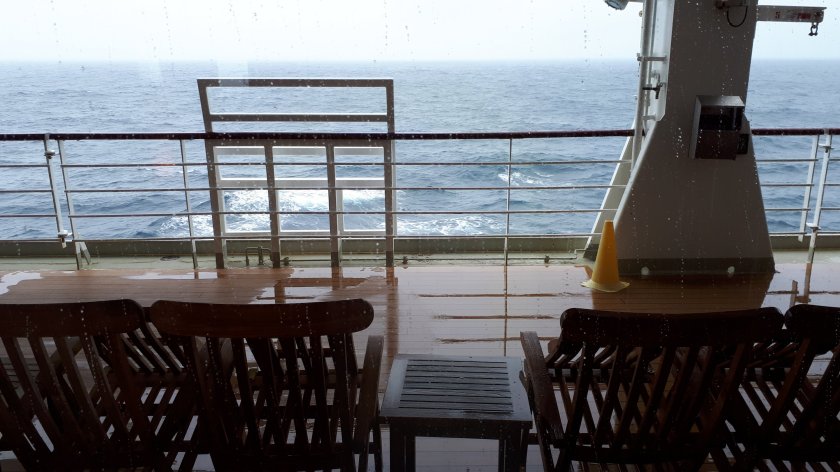 I was pretty tired last night, and was glad to join members of our table for an earlier more casual and relaxed dinner offered by the Lido on Deck 9. There was major storm outside as lightning flashed in rapid bursts of bright light, still visible despite prominent reflections from the floor to ceiling windows of the Lido. We all gave “show-time” a miss and I enjoyed a decent sleep. Howling gales disturbed my slumber this morning. I found the seas tempestuous, the balcony soaking wet with rain and the sky “Manchester grey.” The wind is no longer howling, but I doubt if the open decks will be populated with sun-worshippers any time soon.
