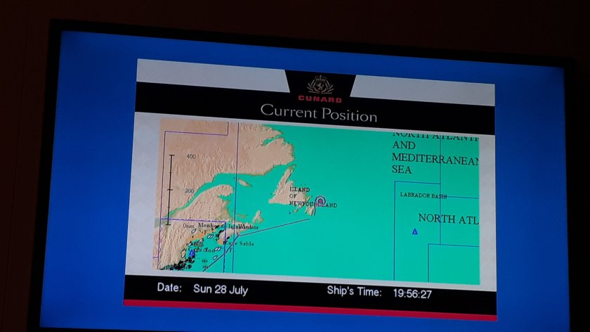 The rest of yesterday “went down hill.” My cold developed further, and I felt it prudent to “quarantine myself.” I returned to my cabin which, thankfully, offers a view of the sea, and fresh air, by pegging the balcony door with a chair. (Cunard frown on this practice, because it messes with the air-conditioning, which cannot be turned off in the individual stateroom.) For the first time, I availed myself of room-service, and was brought a splendid three course lunch.