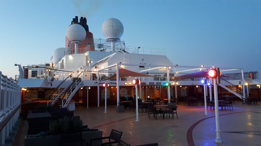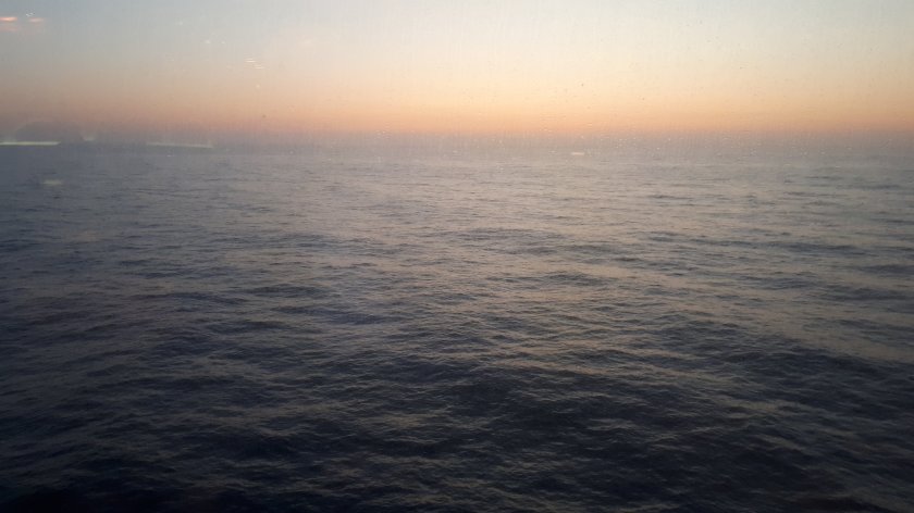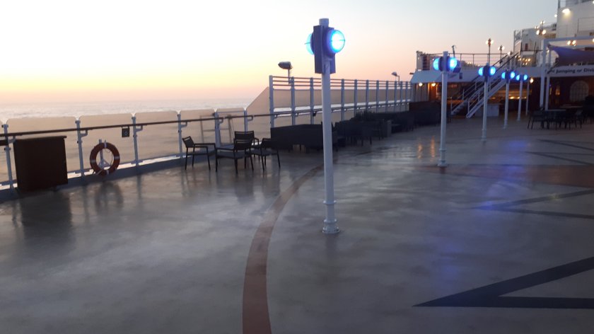 From the Lido area on Deck 9, I am looking out on to a mid-grey moderate sea, and with the sky obscured by a mist of uniform very light grey. That might sound tedious, and it would be for days on end, but for this short while, it does hold a unique beauty, and is most relaxing. North-easterly winds of 30 knots are not conducive to deck walking, although I shall put some warm clothes on and “give it a try.” (14.20hrs, 15.20hrs in the U.K.)