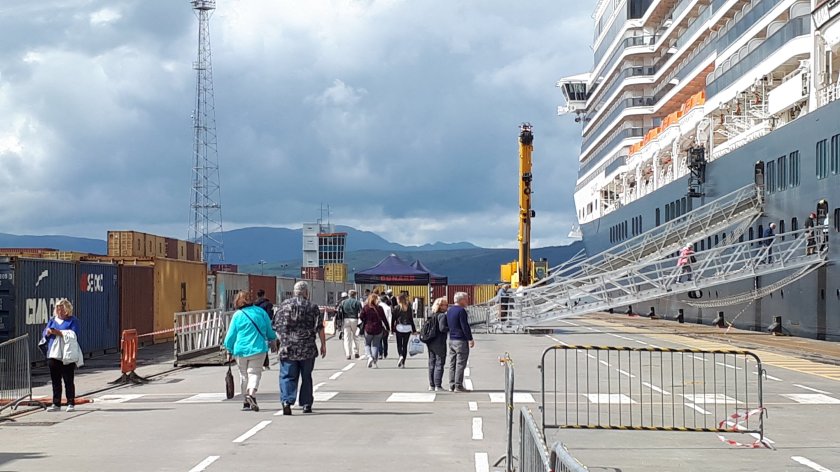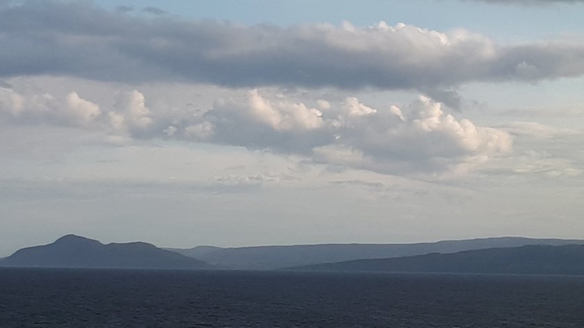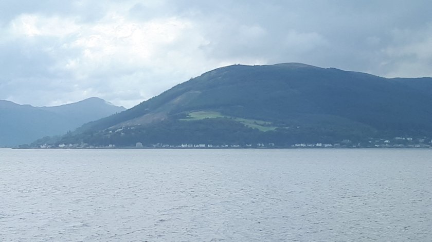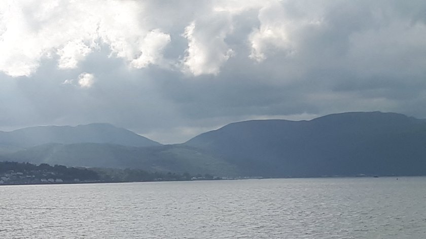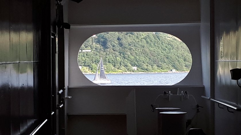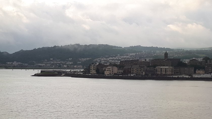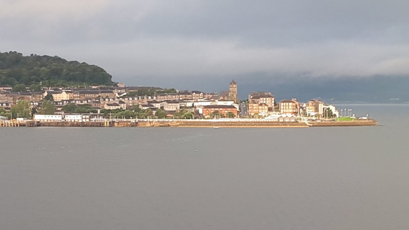 (Above) Not yet 07.00hrs, I ventured out onto my balcony to take these pictures as Queen Elizabeth headed up the Clyde towards Greenock. The weather was on the cusp of deteriorating even then! I had an “enhanced” breakfast in the Lido which offered “inspiring” views of neatly stacked containers against a backdrop of uninspiring high-rises, a couple of churches and architecture from a previous century, all overlooked by low partially wooded hills. “Enhanced” means that because no grapefruit was available, I treated myself to a small plate of cooked food. Now to continue the jig-saw puzzle, that is packing.