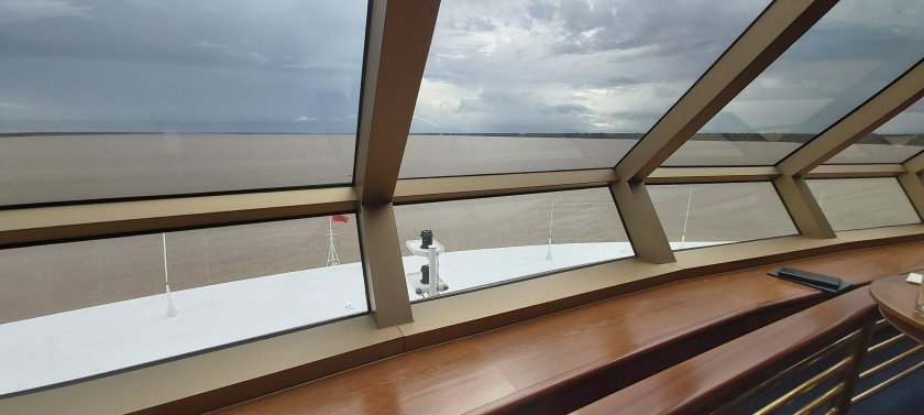 15.10hrs: We are now underway. The low lying sea/river mist has burned off, and a heavy rain shower has cleared the air somewhat. The river banks are now clearly visible on both sides and there is a splendid view forward from the panoramic Commodore Club on Deck 10. Already, I am thinking, “boy! I want to do this again!” This certainly is a voyage of contrasts ranging from the fury of the north Atlantic to the azure waters of the Caribbean and now, the muddy Amazon River. Between the Amazon’s mouth to Manaus is 900 miles. Not bad for one trip, but there is so much more to come in the next eight weeks and two days.