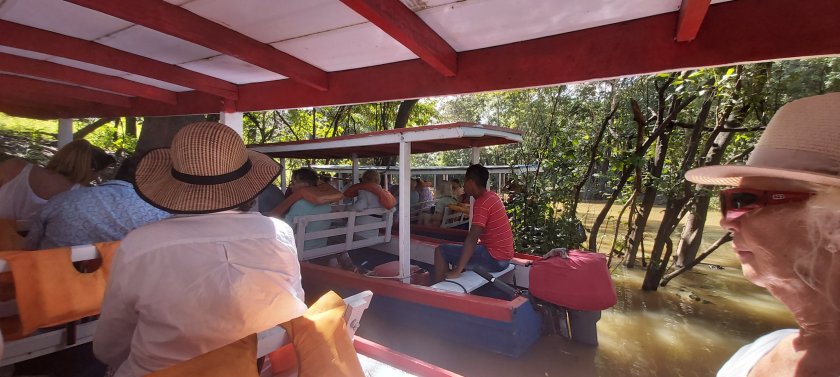 After lunch, and the inevitable but pleasurable look around the souvenir outlet, where I purchased a replacement baseball cap, we boarded (with some difficulty) one of several “motorised” canoes which would venture “deeper into narrow overgrown tributaries, at times, under a dense umbrella of trees that add to the mystery of this region…” Do forgive me for my numerous quotes from the Cunard Brochure!