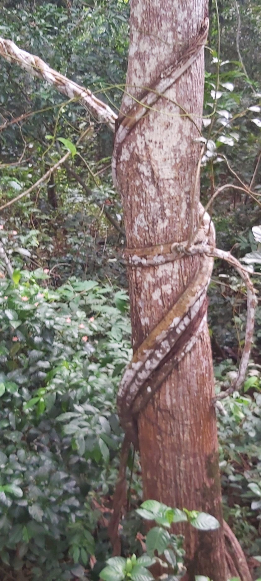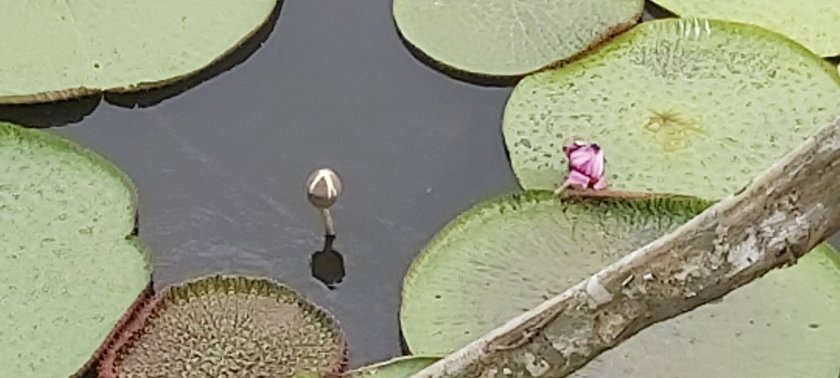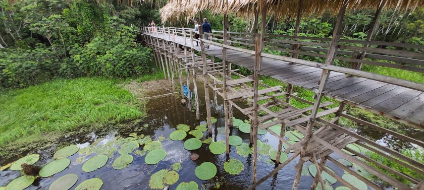 We didn’t get to see the Victoria Regia water lilies from our wonderful motorised canoe. But we did get to see them after walking along a marvellous wooden boardwalk construction, around 300 yards. Again we were under an umbrella of trees for a short distance. On the way, we spotted a monkey, At the end, a wooden elevated covered observation platform afforded overhead views of said water lilies as well as lake view I would probably never see again. On the lilies, a sharp-eyed table companion spotted what we believed was a bany alligator.