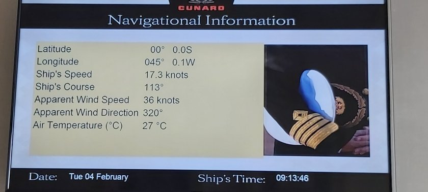 This morning, I am determined to photograph the page on the Navigational Channel which illustrates the position of M.V. Queen Victoria at the precise moment she crosses the Equator, believe it or not, for the third time on this “Discover South America Cruise.”
