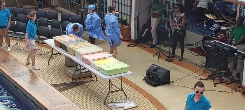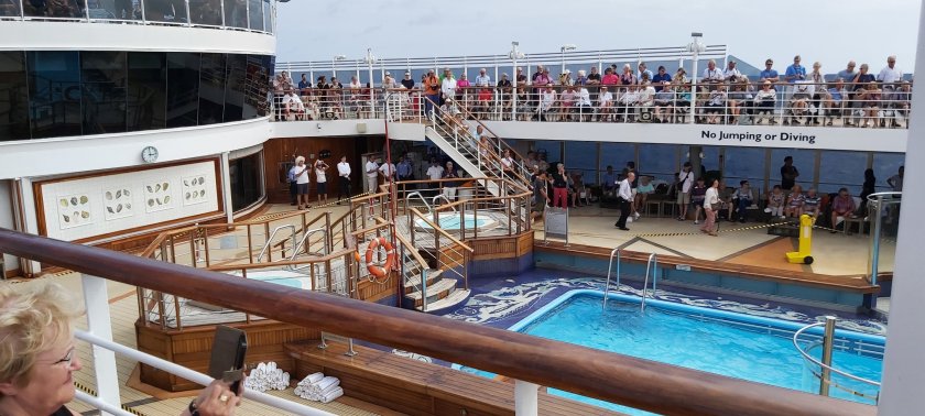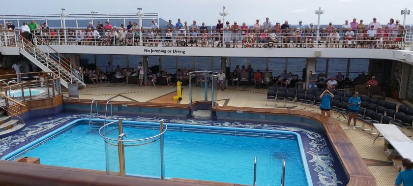 There was, inevitably, the “Crossing the Line ceremony where guests who have never crossed the Equator before volunteer to be charged at the Court of King Neptune, for various “silly” offences. Being doused in multi-coloured sludge as well as out-of-sell-by-date spaghetti, and then tossed into the swimming pool is by way of public sentence.