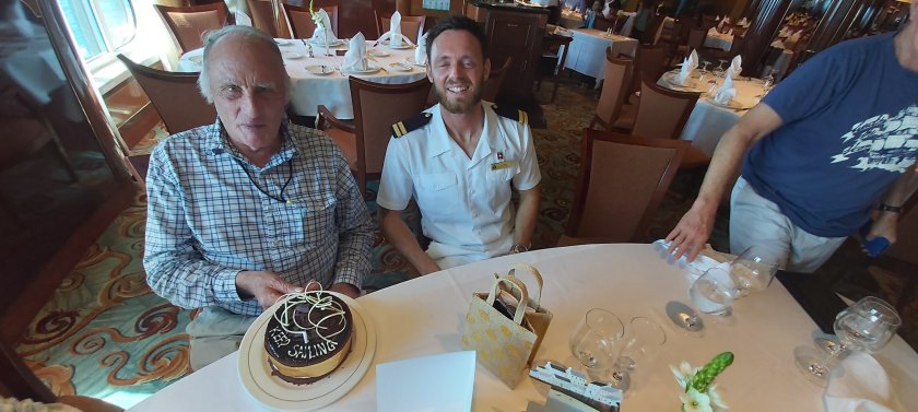 It is Peter’s birthday today, Peter being one of my original table companions before I joined Jo’s table nearby. I was “welcomed back” to join his birthday celebration over an excellent lunch with a ship’s engineer in attendance.
