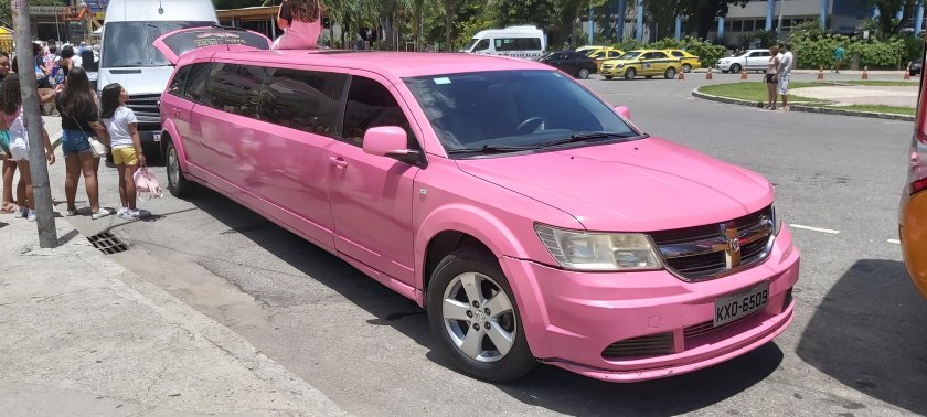 A pink stretch limousine, and views of and from Sugar Loaf Mountain.