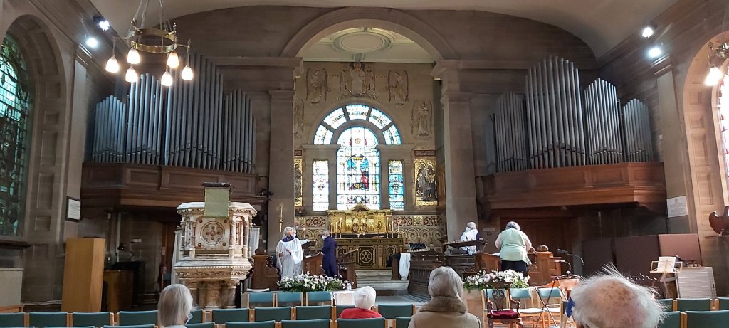 I felt an unexpected sense of relief when, after the usual pandemic precautions, I was shown to any seat with an order of service placed on it. “Very well thought-out” I mumbled to myself as I duly chose where to sit. I was far from alone, although some designated seats did remain unoccupied. Michael Williams resumed his place at the organ, and the permitted choir of six were of “cathedral quality”. Rector Liz English and Rector (elsewhere to be) Keith Cocking presided with utmost dignity. Keith’s homily was on the subject of forgiveness, and a timely reminder on the subject!
