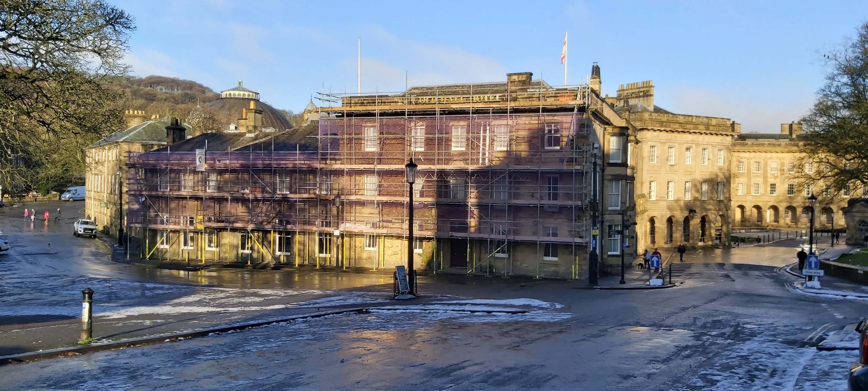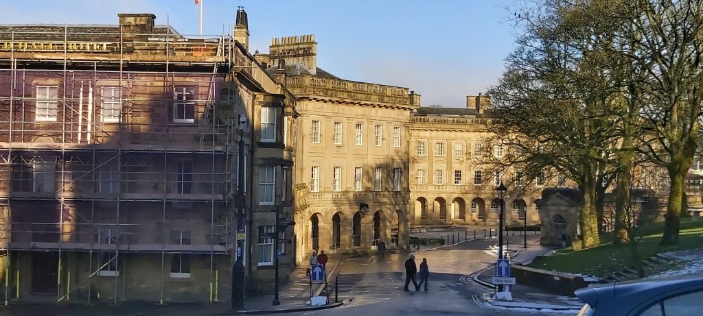 While in Buxton, I took a couple of photographs looking towards the Crescent and the Old Hall Hotel, now covered with scaffolding, but with a nice new gold sign replacing the weather-beaten incomplete sign that not long ago, gave the hotel a run-down appearance.