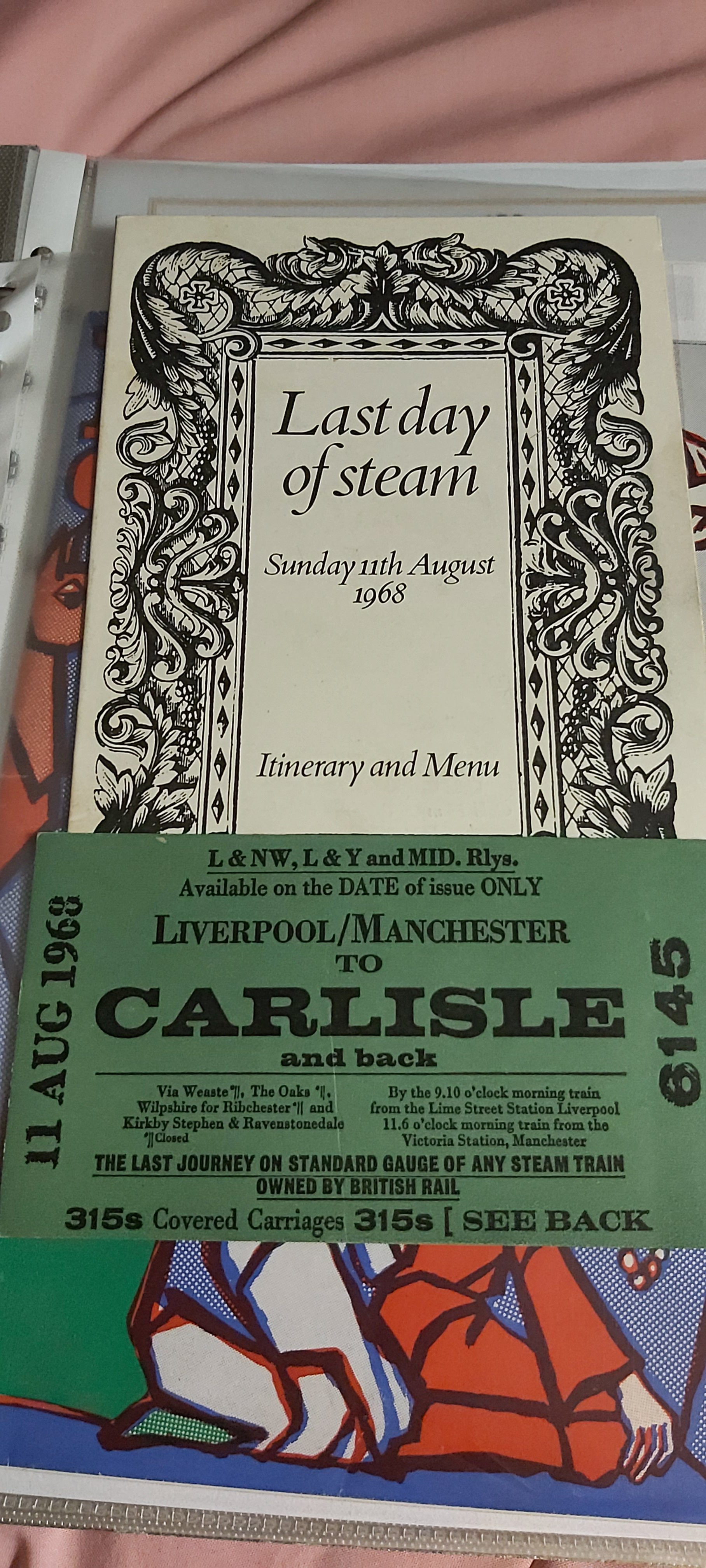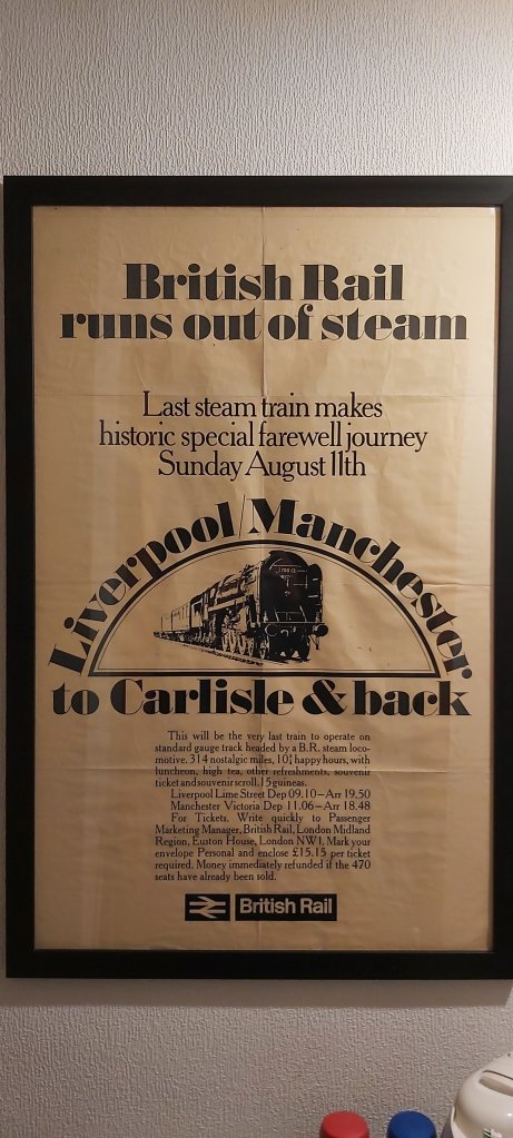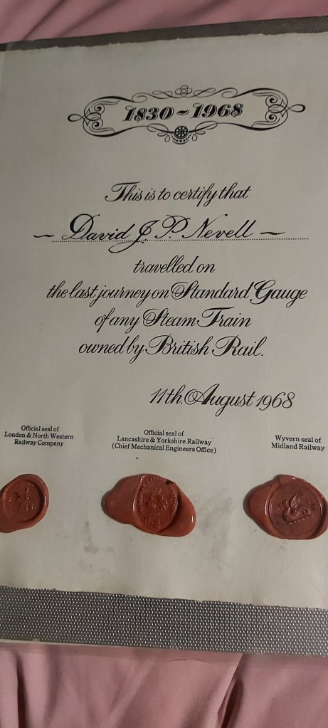 Huge green tickets were the authority to travel on The Last Steam Train; passengers were also issued with commemorative certificates which I have never seen for sale on eBay. Mine remains in an album purchased at the time, still awaiting framing! Red seals of the former railway companies over whose territory the the train travelled, embossed on the certificate makes forging just about impossible, and probably not worth the expense. Back in 1968, I could never imagine life fifty three years hence. Looking back over that same period of time seems stranger still.