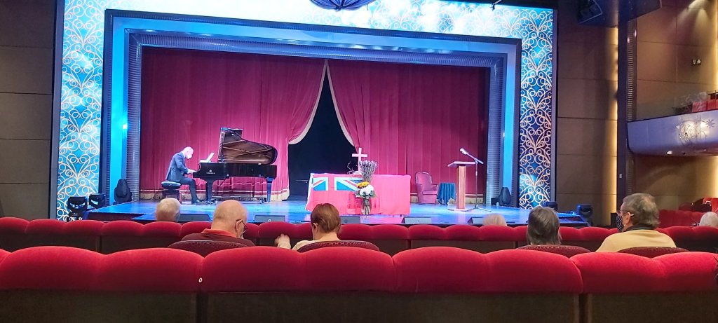 Being Sunday, I did attend the Traditional Maritime Church Service at 10.00hrs. The Third Sunday of Epiphany was observed by a socially distanced congregation who sang through their mandatory masks in much better voice than I can ever achieve these days when not wearing a mask. Given the limitations of worship on a passenger liner, it was a very good and meaningful service even if, as instructed on the front page of the Daily Programme,….”masks are required to be worn throughout the entire performance…..” Actually, worship at some High Anglican churches could be seen as a performance considering the skill of the musicians and choir, the intellect of the clergy….and the tireless work of the Churchwardens!
