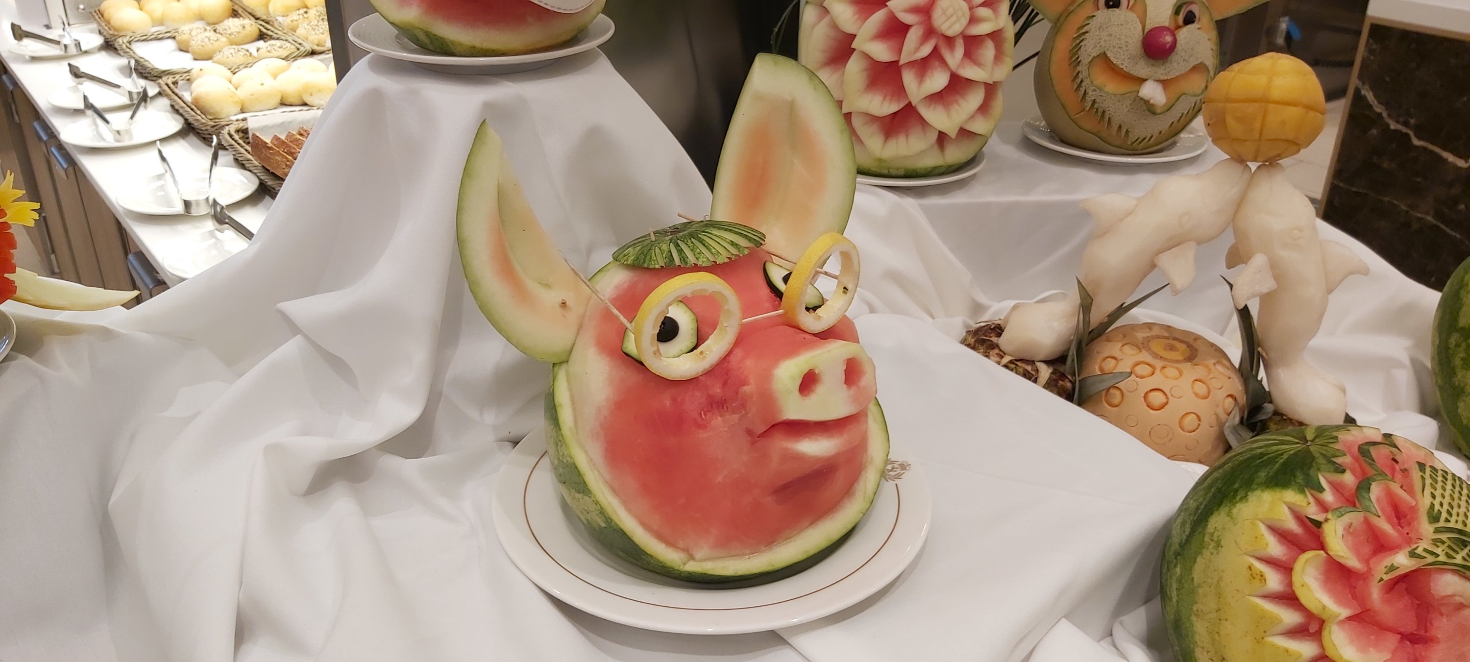It had to happen! The final full day of this magnificent 28 night voyage is here, and, apart from the numerous nocturnal comfort stops, I had a decent night’s sleep, possibly due in part to the motion sickness medication I took yesterday afternoon. Last night was “Red and Gold” night, the idea being that formal wear, and events during the day, should be red and gold themed. Thus, the white tuxedo got its final airing, and my (very difficult to put on) red tie was back in Buxton! I am well-on with the packing, but I must not be complacent if I am to avoid the usual last minute panic of previous cruises.