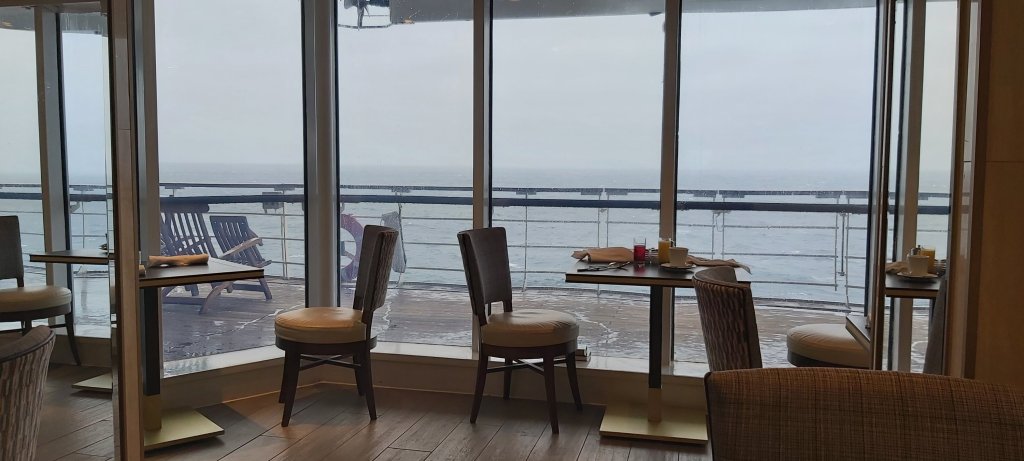 I have just finished my regular breakfast of porridge, banana, yoghurt, and a decaff coffee. Complimentary lunch has been booked in the Verandah Restaurant aft on Deck 8. Jo ( QM2 World Voyage 2018 and QV South America 2020) will join me for, maybe, an afternoon of reminiscing.