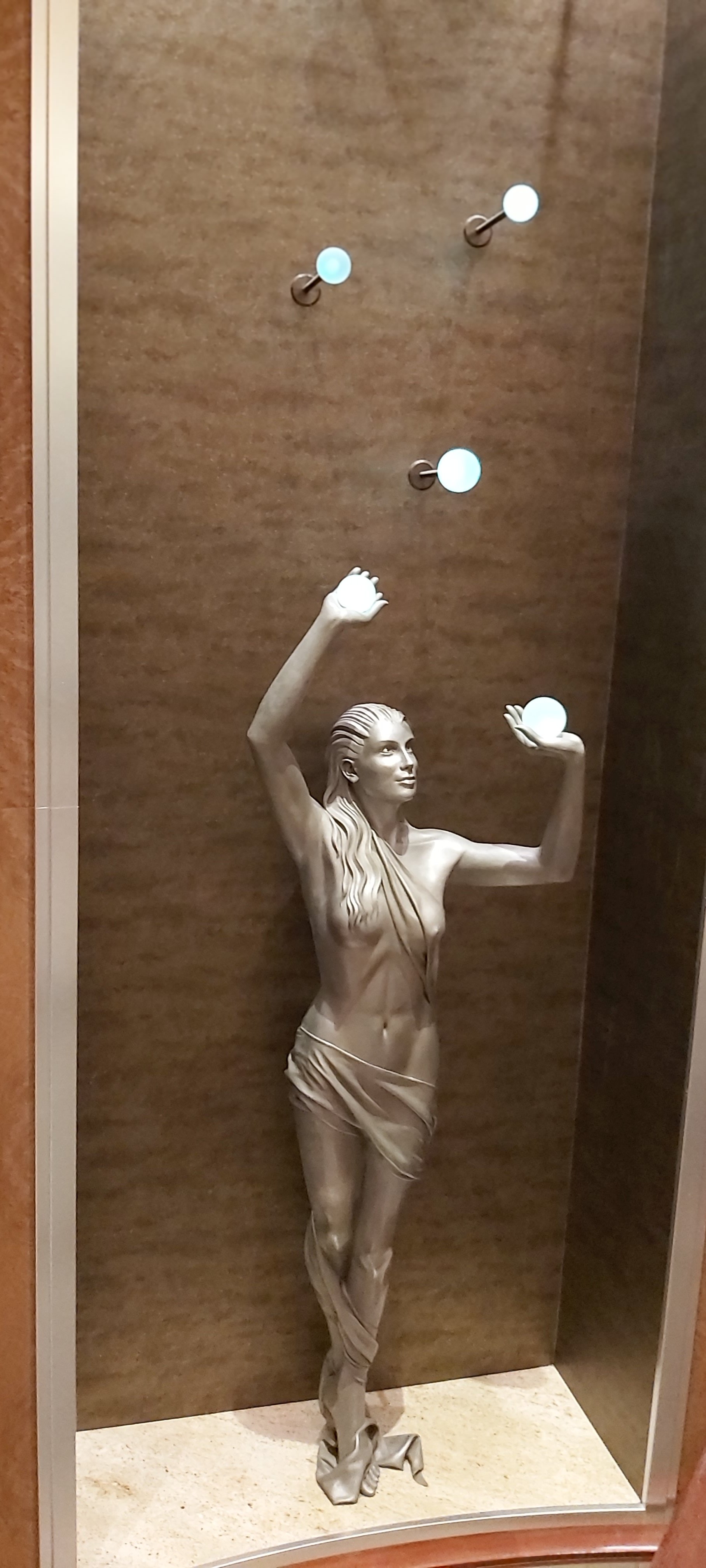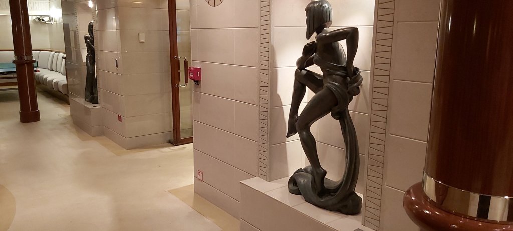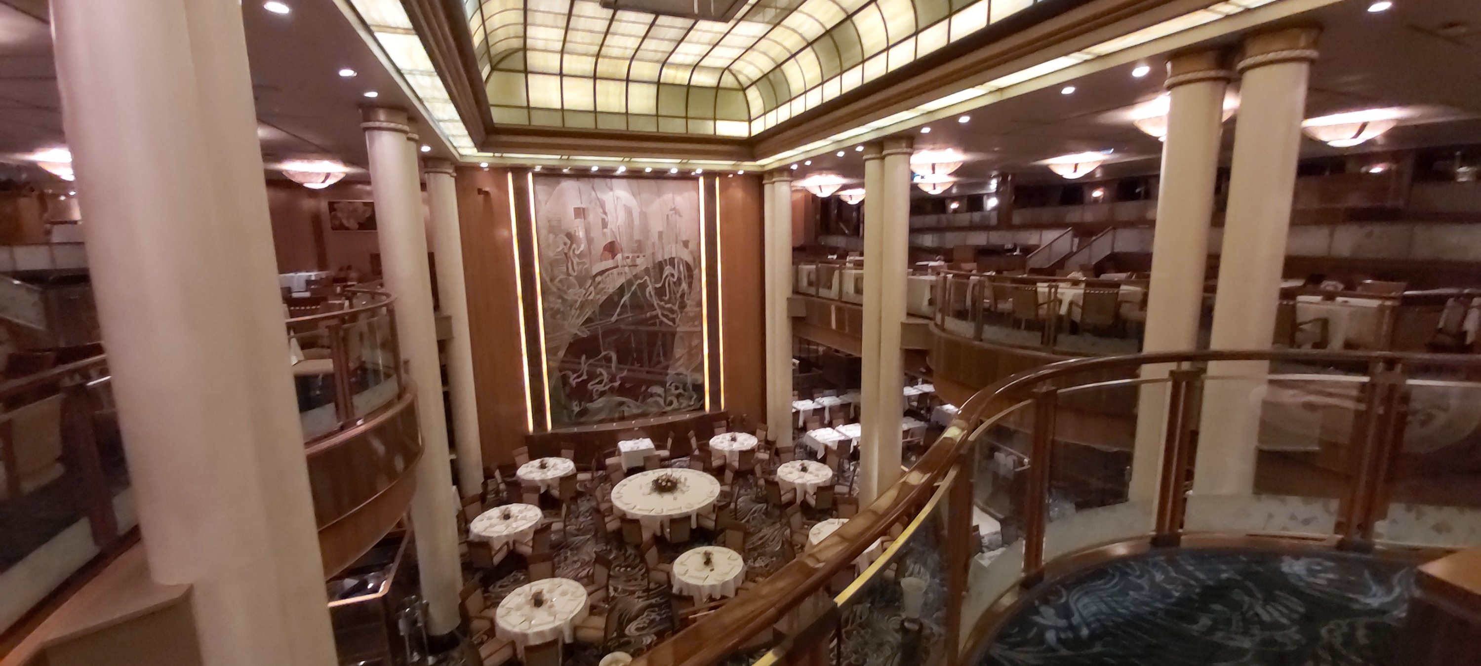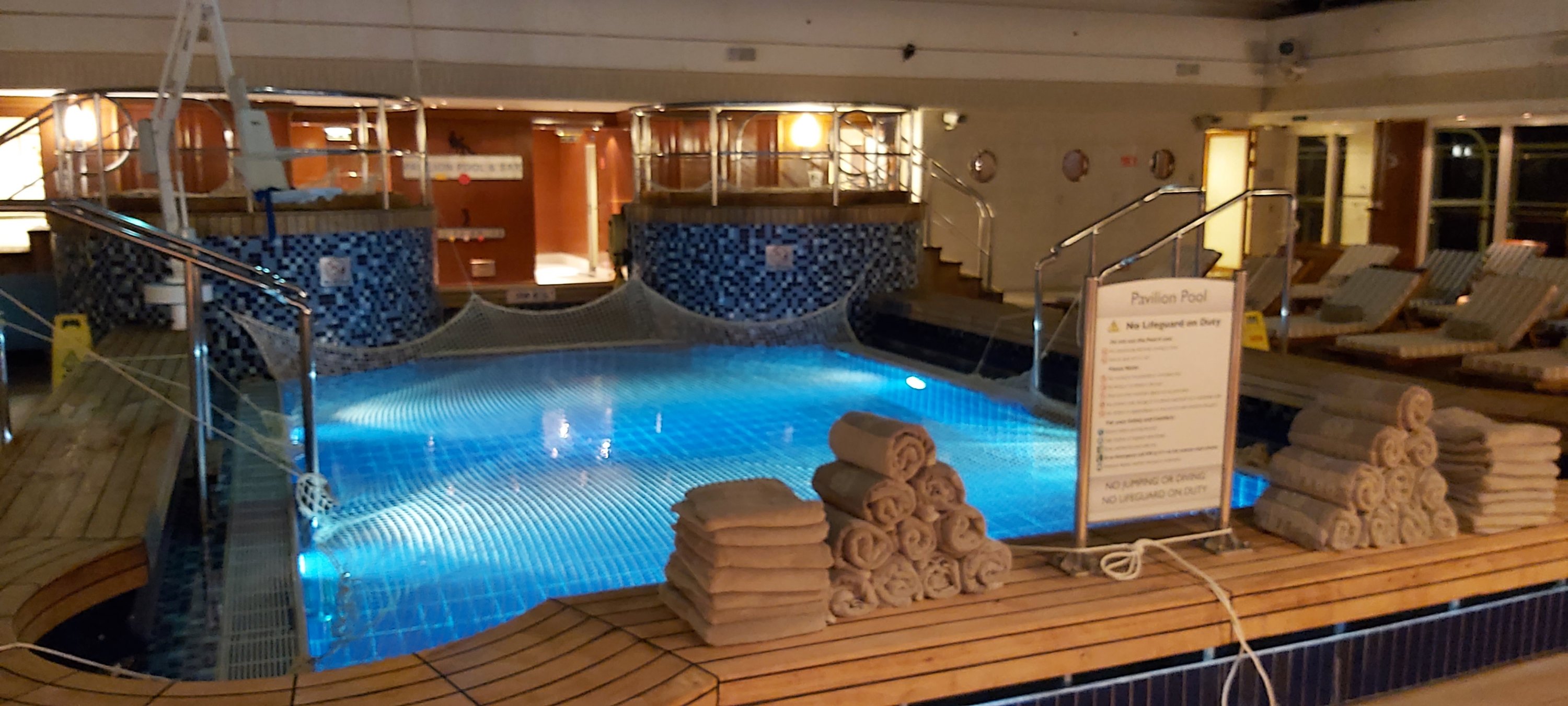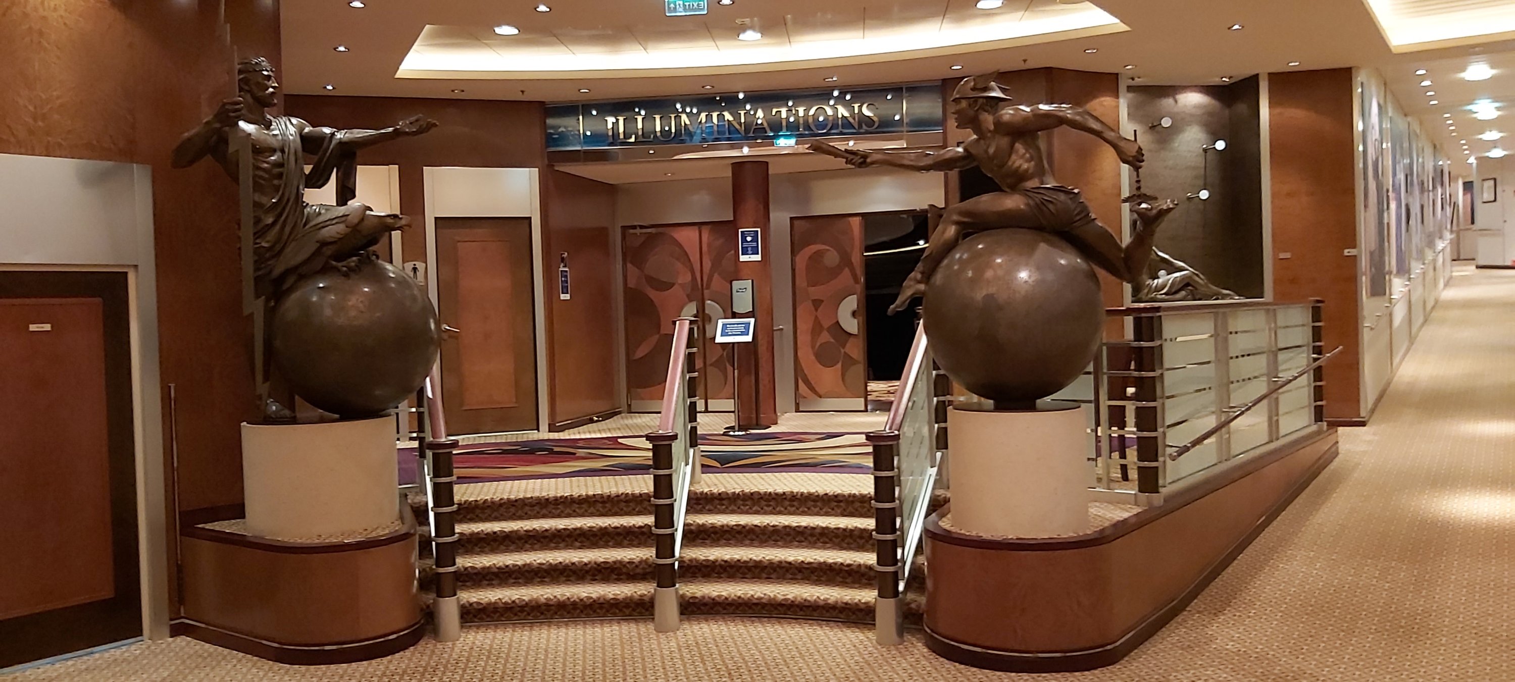 Exit to the pool area, Deck 12The moon shines through the retractable roof above the pool Deck 12The pool, 12 Deck, closed for the night, with net coveringWalkway to Illuminations, the cinema/lecture hall, Deck 3Entrance to Illuminations Statue at staircase near the cinema/lecture room, Illuminations. An almost deserted Grand Lobby from Deck 3Laid up for final day’s breakfast A final look at the Upper Britannia Restaurant.