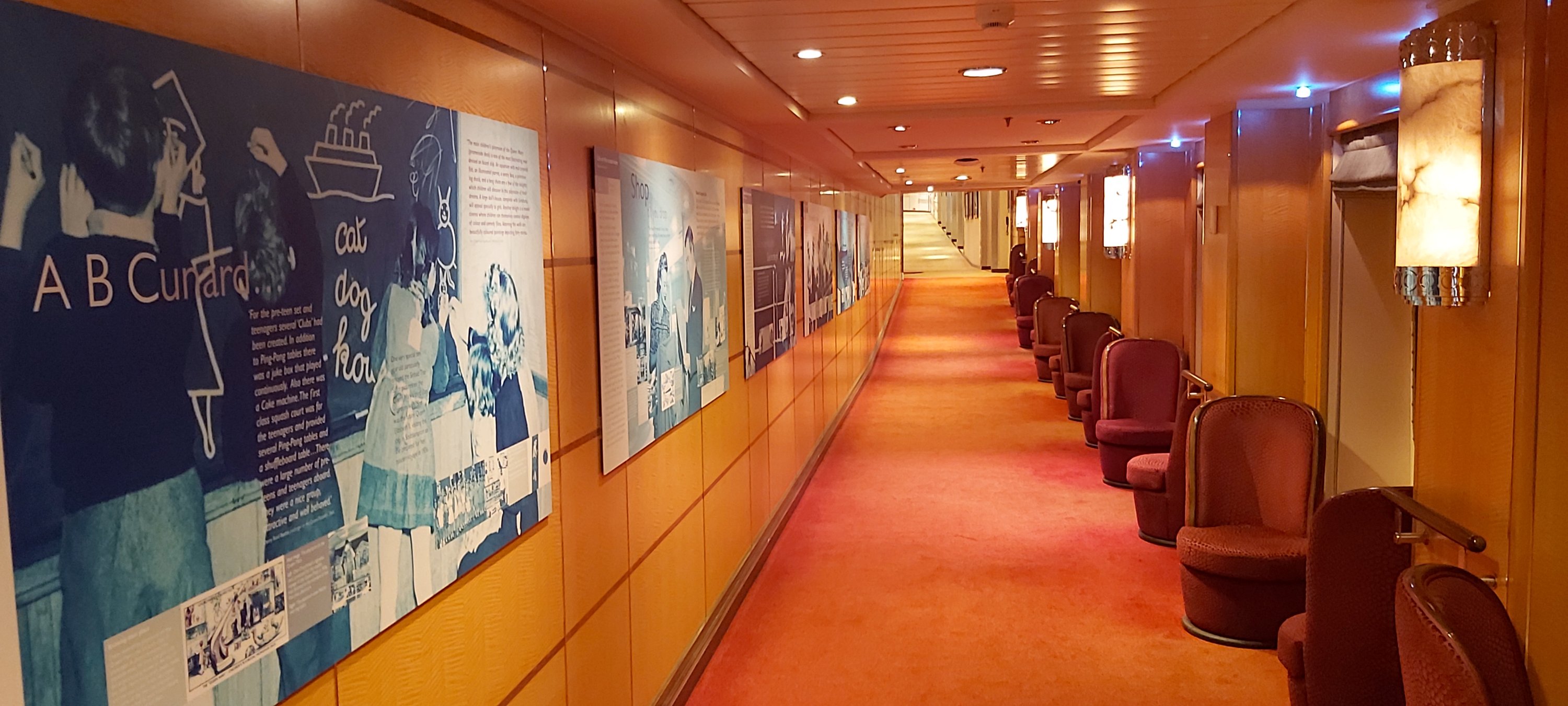 There have probably been worse seas, but, outside it is choppy and not so many shades of grey. Occasionally, a small part of the ocean will glisten where the sun has managed to come through. The Carinthia Lounge (originally the not very successful Winter Garden, does come into its own during a transatlantic crossing. Although the open decks are closed due to high winds, I managed to join a few hardy souls for less than a lap of the Boat Deck. Winds from the southwest are strong outside and hard for me to battle against.