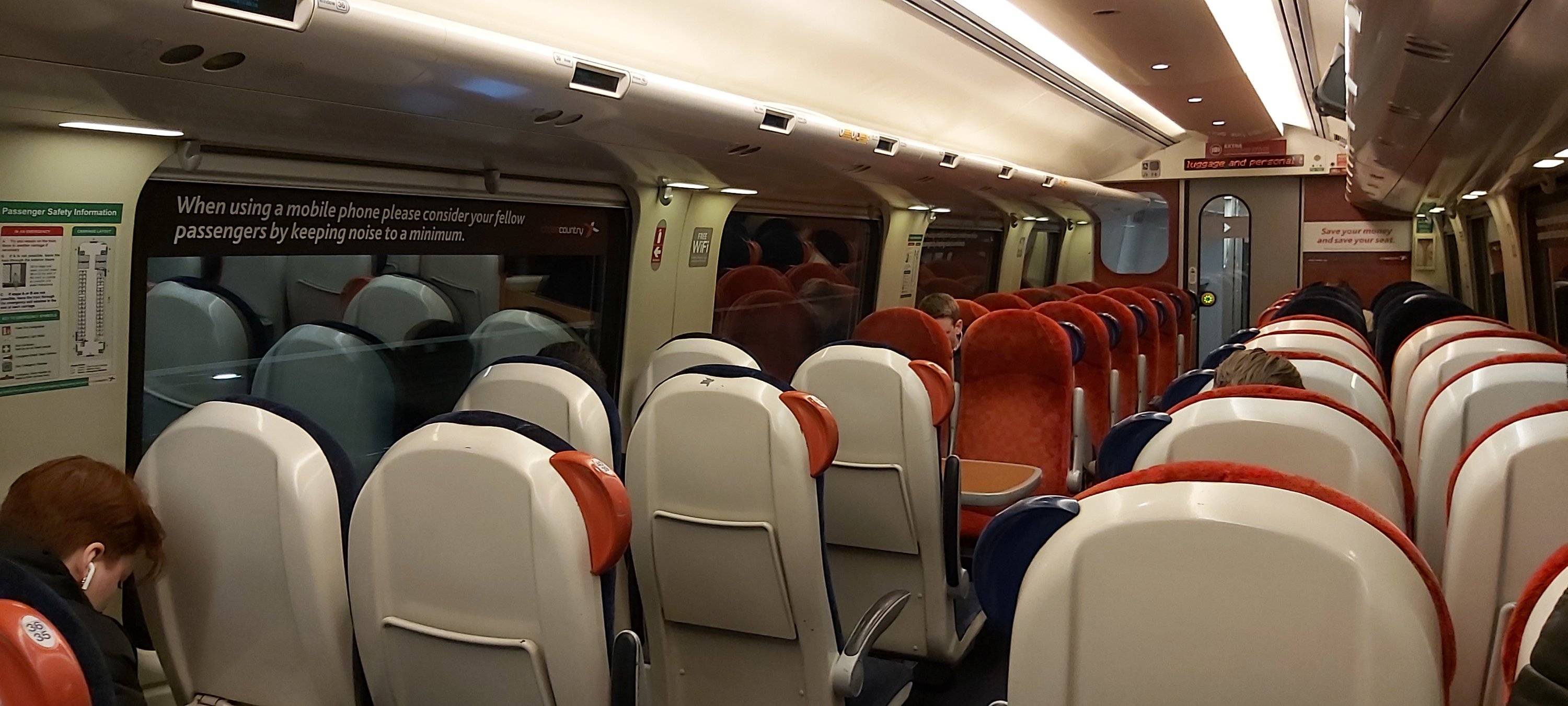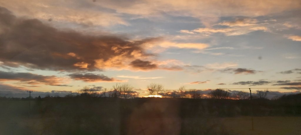 I am enjoying my first train ride in around 25 months, and not having tons of luggage to trail around, there was no real justification in going First Class, where generally, there is adequate luggage space. There is a glorious sunset as we speed towards Oxford from Banbury. Two four-car Voyager units form today’s train which is well filled but not overly crowded, with most passengers boarding and alighting at stations along the route.
