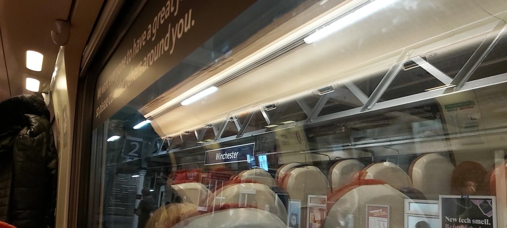 It is now almost dark, and my forward facing seat is no longer, as at Reading, the Driver changes ends for the train to continue south to Basingstoke. These Voyager sets were originally part of Virgin Trains, and the coach I am riding in appears to be no different inside than when first introduced c2001. While not a big fan of these particular units, their introduction did enable an hourly service between Manchester and Bournemouth and therefore, Macclesfield and Southampton, which negated the need, if travelling to either Southampton or Bournemouth of having to go via London and traipsing across to Waterloo either by bus, taxi or the Northern Line.