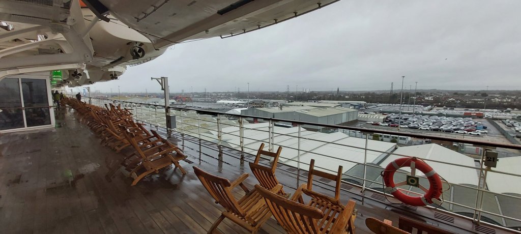 Taken this morning as we steam towards the English Channel. It’s grey, the F2 breeze persists from the north east, and only a few hardy people, dressed for winter are braving the Promenade Deck this morning.