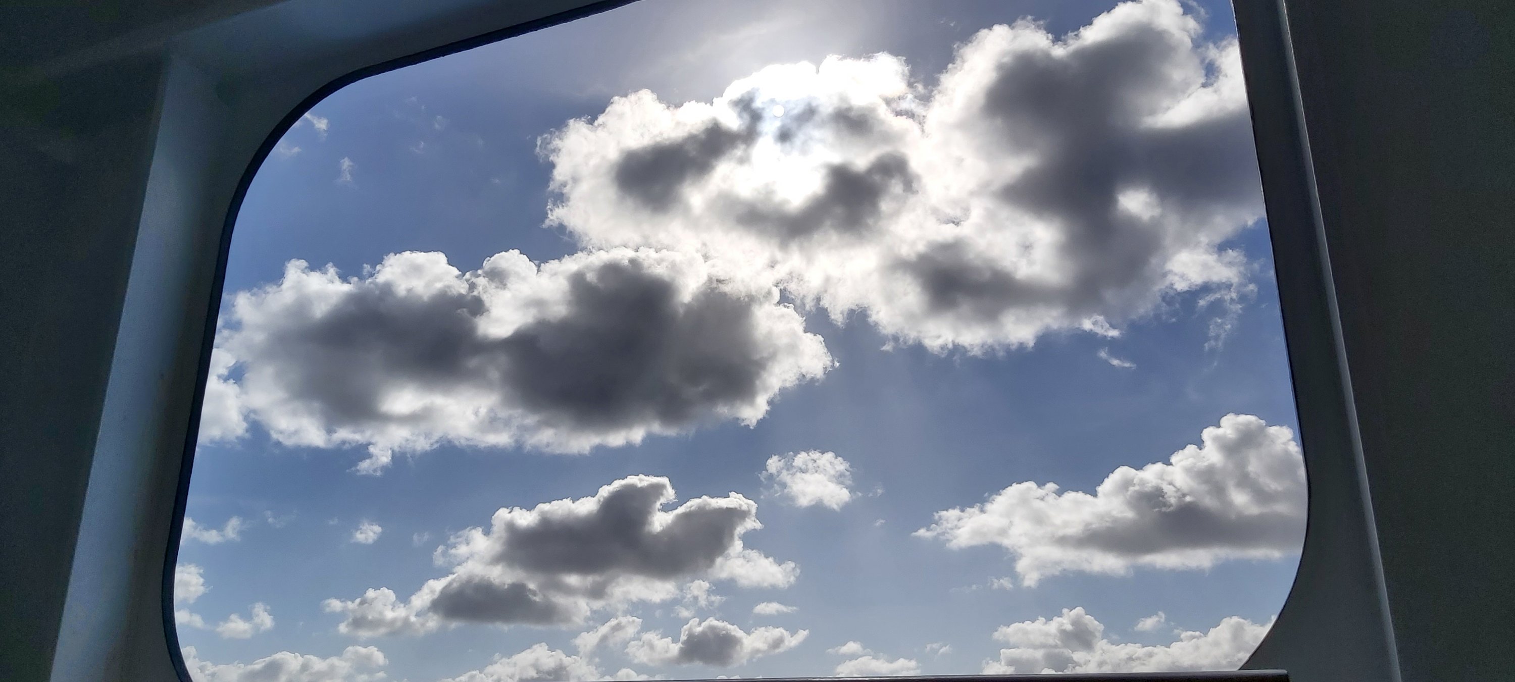 This morning, blue, but cloudy skies are what I look out to from my still bouncy stateroom. The televised Navigational Information tells me we are continuing very slightly south westerly as we pass north of the Azores later in the day. Air temperature is an acceptable 11 degrees Celsius and thankfully, the wind across the decks, last night reaching the mid 80s knots, is about half that this morning. The sun streams more abundantly into my sheltered balcony (08.51 hrs)