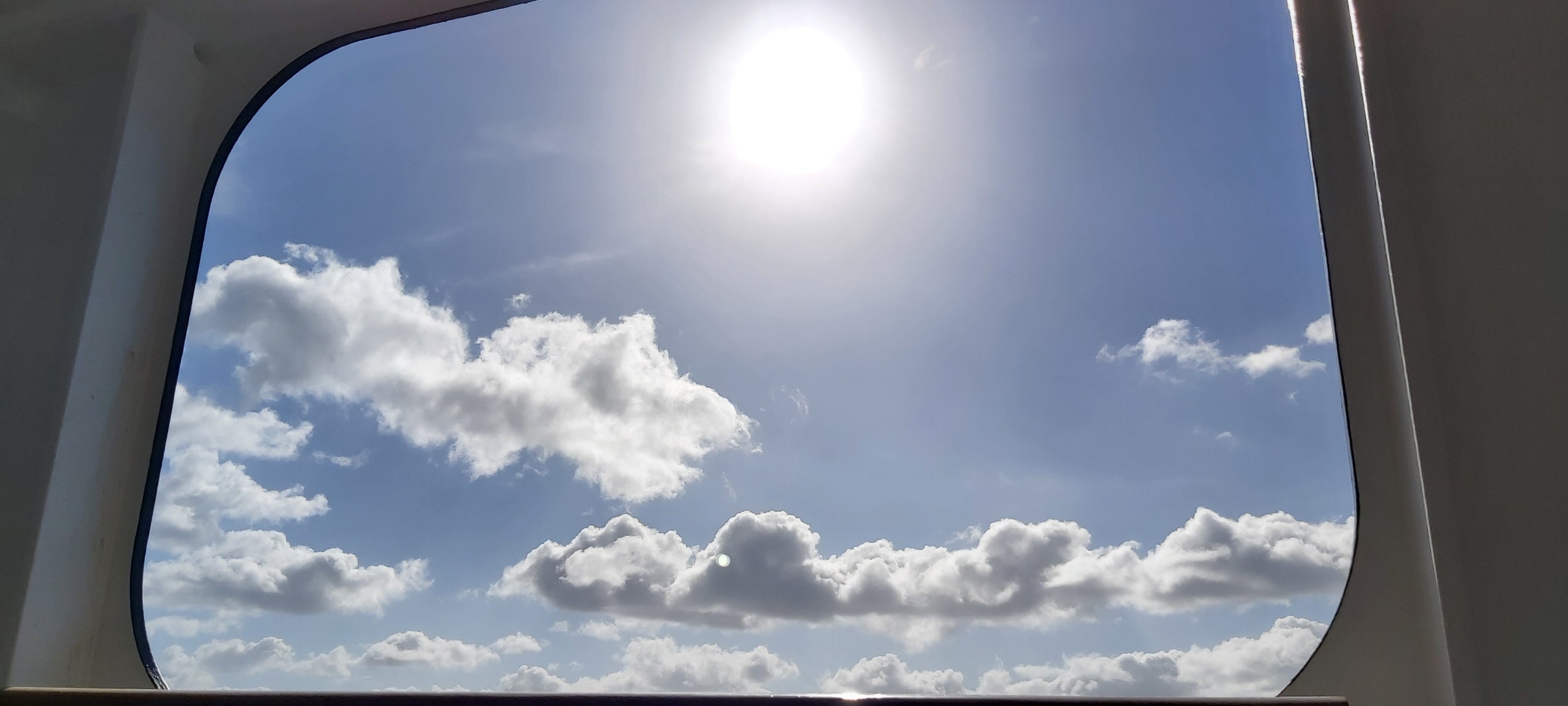 Although breezy outside, I shall try to improve on yesterday’s miserable attempt at deck walking. The sea still appears rough, and the ship responding to the vagaries of the ocean. To say I am delighted with being able to spend so much time on board is an understatement. The changing appearance, and characteristics of the sea and sky continue to impress, like hearing wonderful music one never tires of. 11.19hrs GMT -2. There is no time change tomorrow morning.