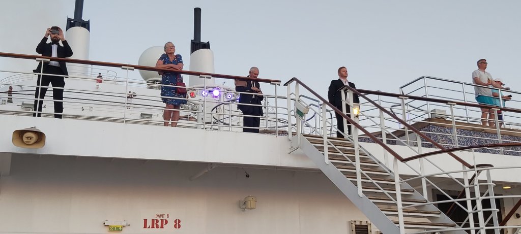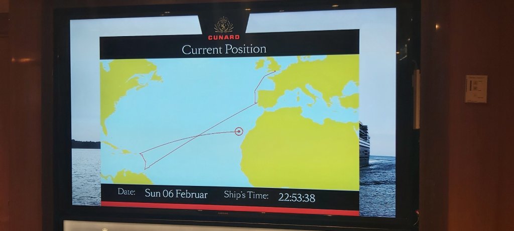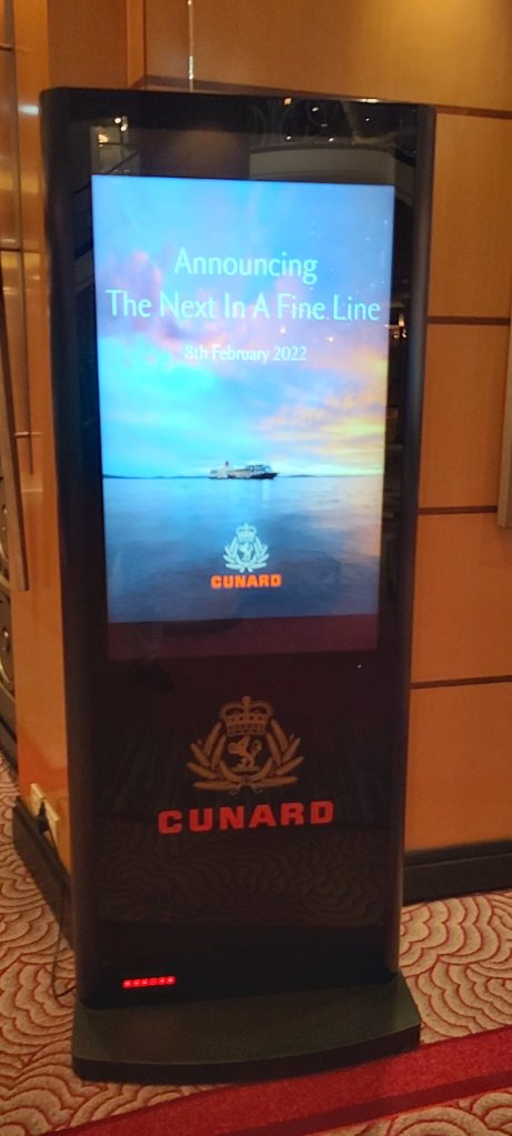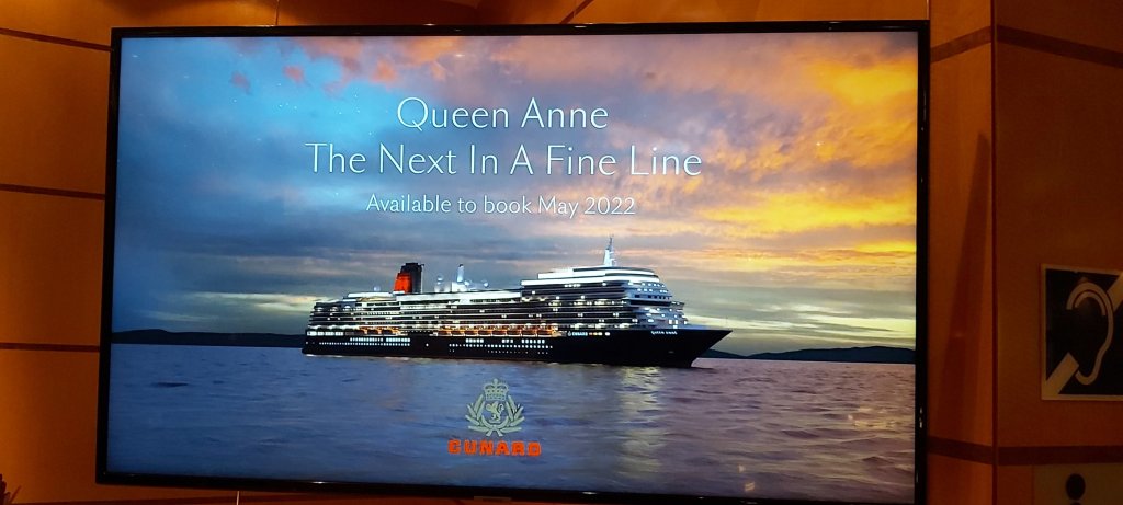 Cunard may have missed another trick. Unless I am mistaken, I believe the name of the new Cunarder is being announced at 13.00hrs. Gala Night, I feel, should have been tonight, thus allowing a welcome extra day to pack the dinner suit. Complimentary drinks could have been offered to each passenger, especially in lieu of the pandemic affected cocktail parties, and also, a general celebration over dinner with souvenir menus might have been quite fitting. There is not even a mention of this announcement in today’s Daily Programme. “Caronia” has been suggested as a contender for name of the new ship. That would make it the fourth Cunarder to bear the name, the first entering service in 1905, the second, the year of my birth, 1949, and the third in 2000, being the former Vistafjord of Norwegian American Line which entered service in the early 1970s, acquired shortly afterwards by Cunard as a First Class only ship. While in the company of Dean and Julie as well as Alan and Sue, in the Carinthia Lounge, Captain Hall, right on the dot of 1pm addressed all passengers and crew, announcing the name of Cunard’s new ship, QUEEN ANNE. I do hope I can be on its maiden voyage at the end of 2024, when I shall be 75. (Unbelievable!) Cunard will then have a fleet of three cruise ships and one Ocean Liner.