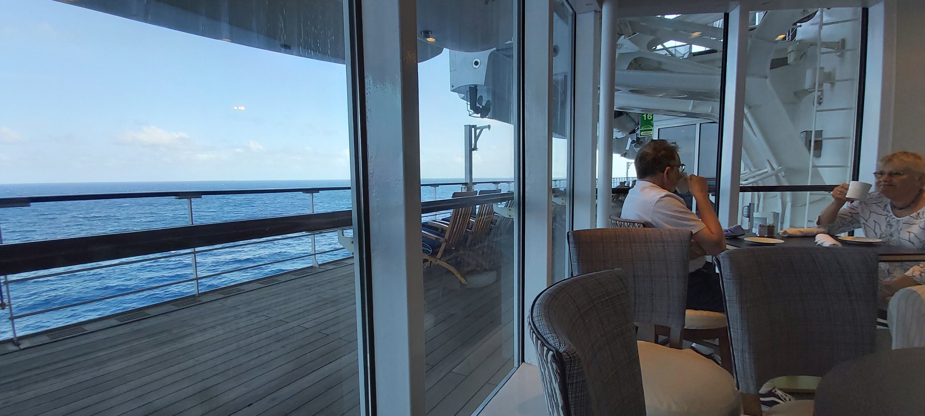 I have been reminded that whist sessions resume in the Atlantic Room, forward on Deck 11. Thankfully, this is a convivial couple of hours (usually less). I hear horror stories of the Bridge sessions elsewhere on board. But that’s all they are, stories – I think! I also stay away from the launderette. Right now, I am in my favourite public area, The Carinthia Lounge. Laura was in the middle of an on-board general knowledge quiz, which as ever, remains very popular and well attended. I have come across Laura from Fleetwood on previous Cunard voyages and her dry Lancashire presentation and humour goes down well. By myself, I am usually lucky to answer 3 or 4 out of 20 questions correctly, although on a previous trip, I did assist a team to a full 20 – just once, I think.