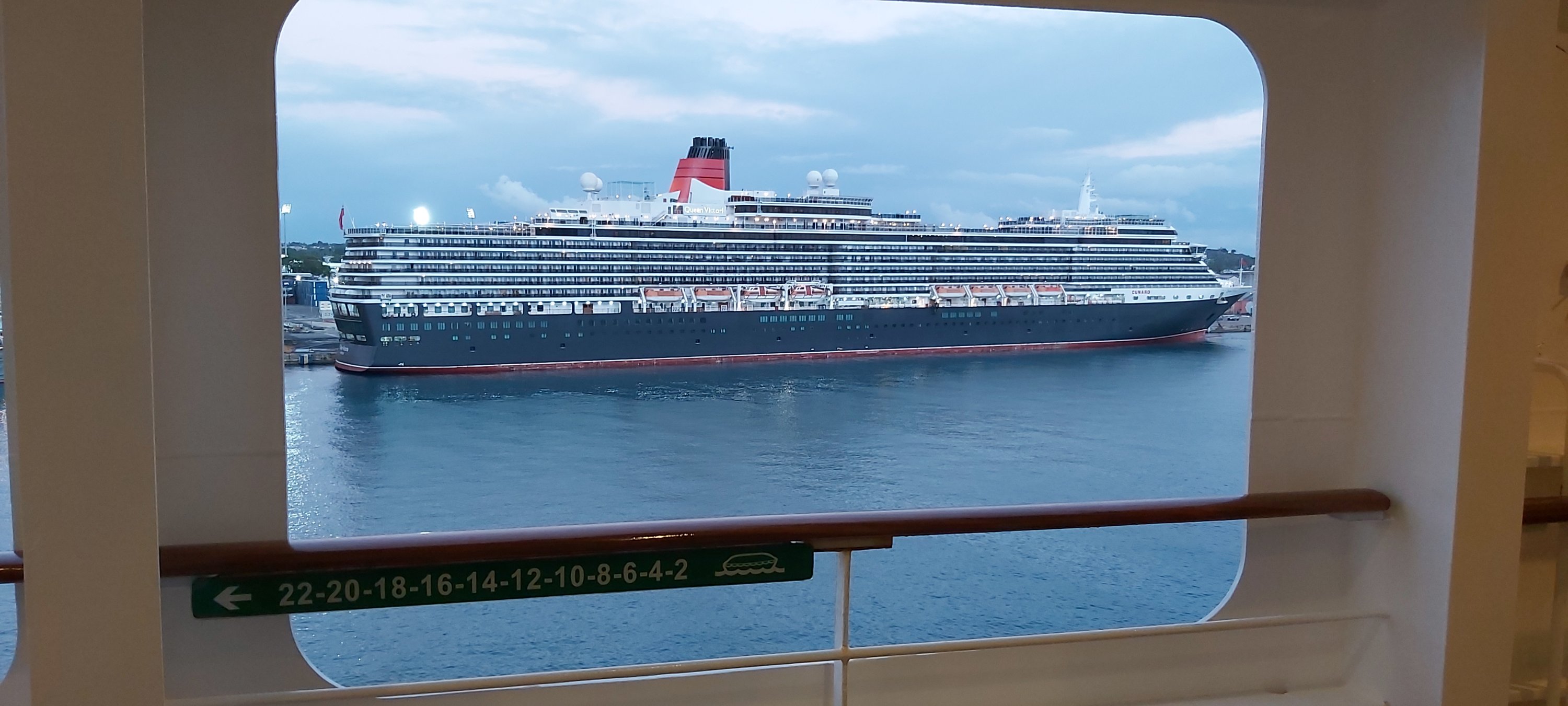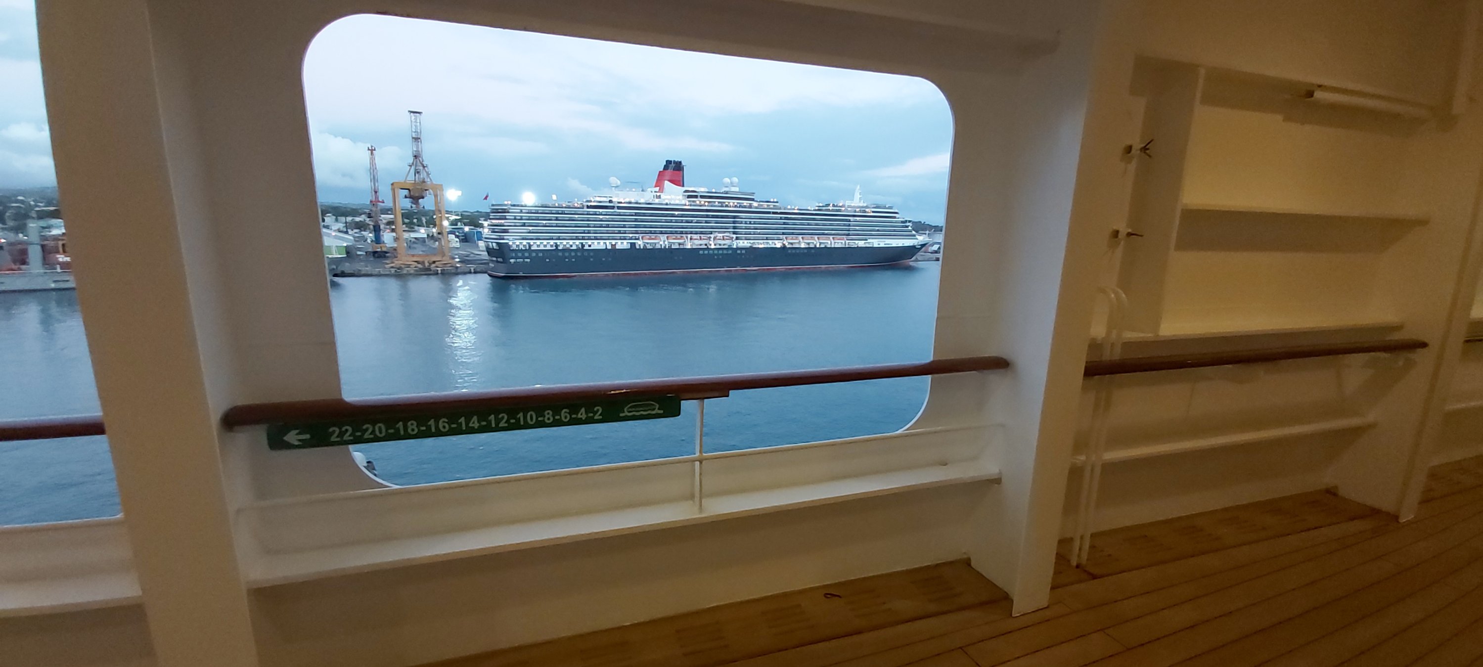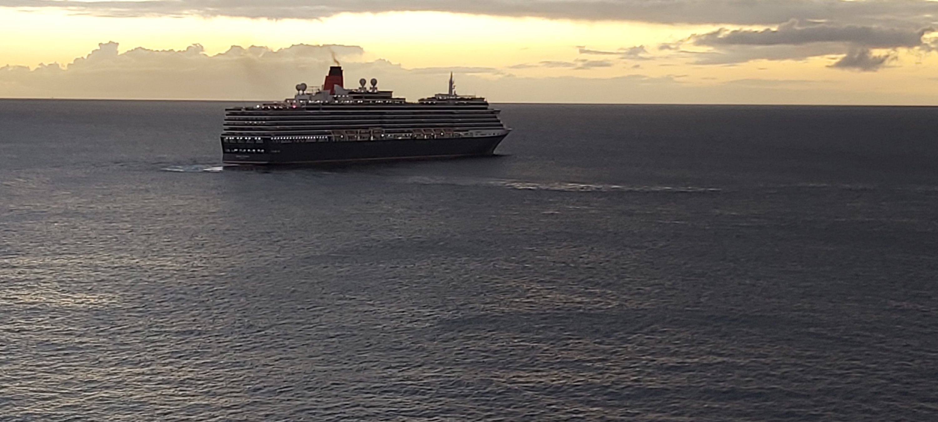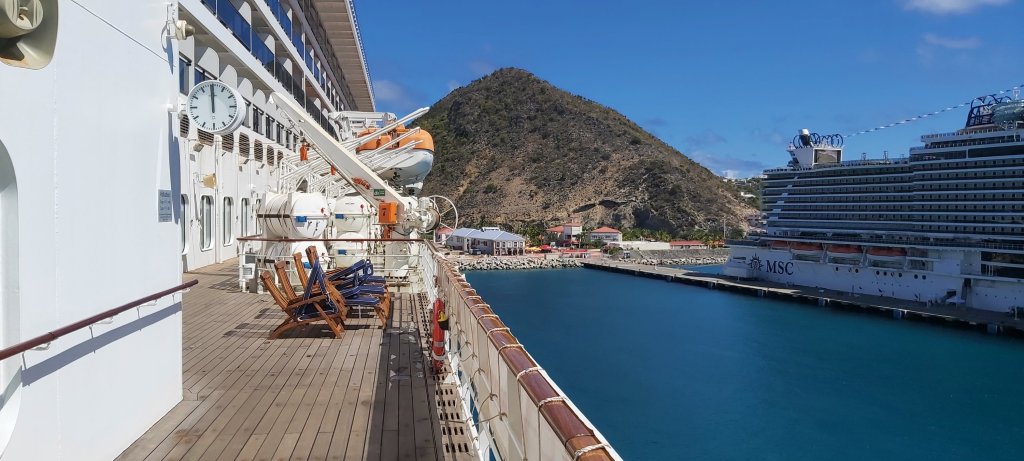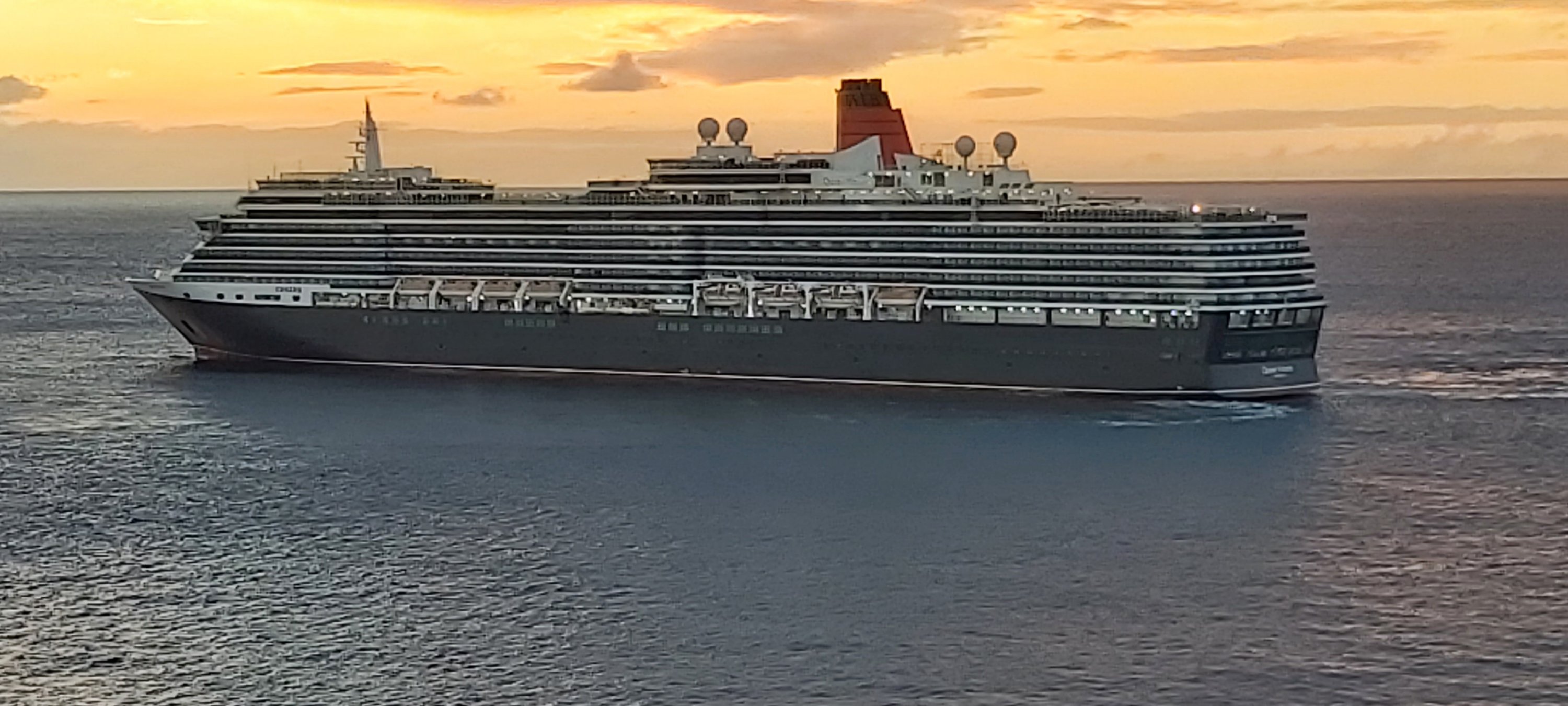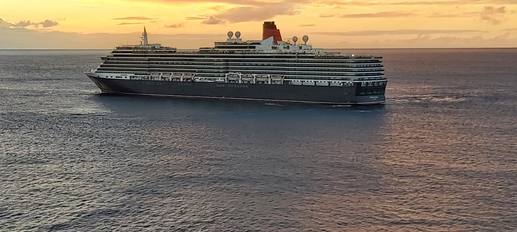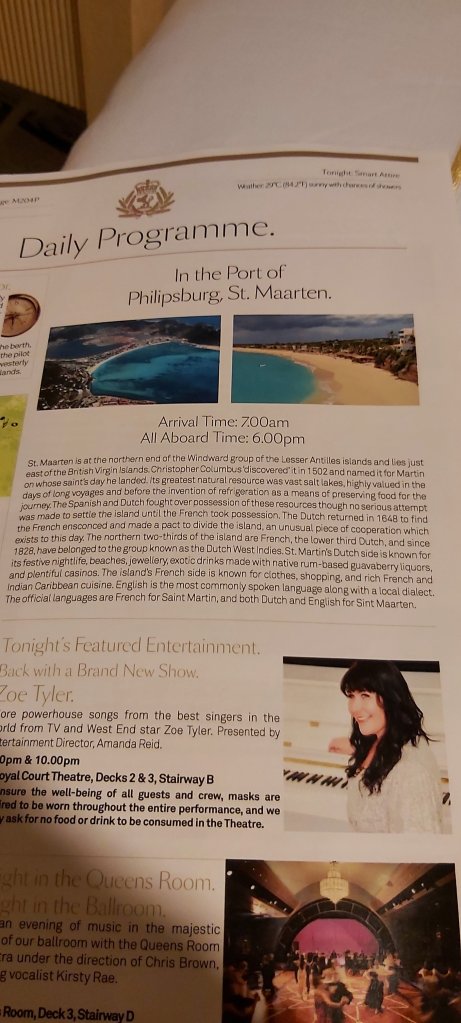 Yesterday felt like one I never wanted to end. Courtesy of Cunard, I enjoyed the challenging and extremely scenic hike along the coastal path. Being a Sunday, Philipsburg was not quite as vibrant as it might otherwise have been. But there was still that ambiance of joy with local music belting out from an al fresco bar only yards from the piers where MSC’s Seaview, and Cunard’s QM2 were berthed. Back on board at around 5 30pm, I just needed a cup of tea to chill out from the afternoon’s exertions. This was forthcoming in the King’s Court eatery, already being laid up for buffet dinner. The sun was setting rapidly and the usual magnificent Caribbean sunset soon exhibited its splendour and the sky appeared to be on fire. Soon, it was time to change for dinner, where Jack Joan, Jean and I were joined by a couple from Kent. At the show which followed in the Royal Court Theatre, the singer for the night Zoe Tyler, sang a bunch of (usually) well known songs with the passion of an artiste at the top of her game. Favourites of mine were her among her repertoire. I was not ready for slumber quite yet, and ventured to the pool area aft on Deck 8 where dancing under the stars was drawing to a close. The novelty of warm nights in January never wears off.