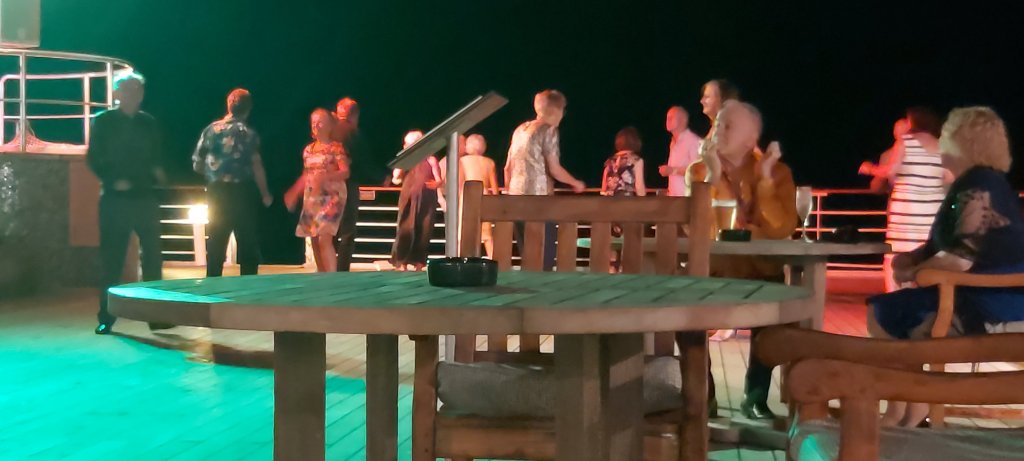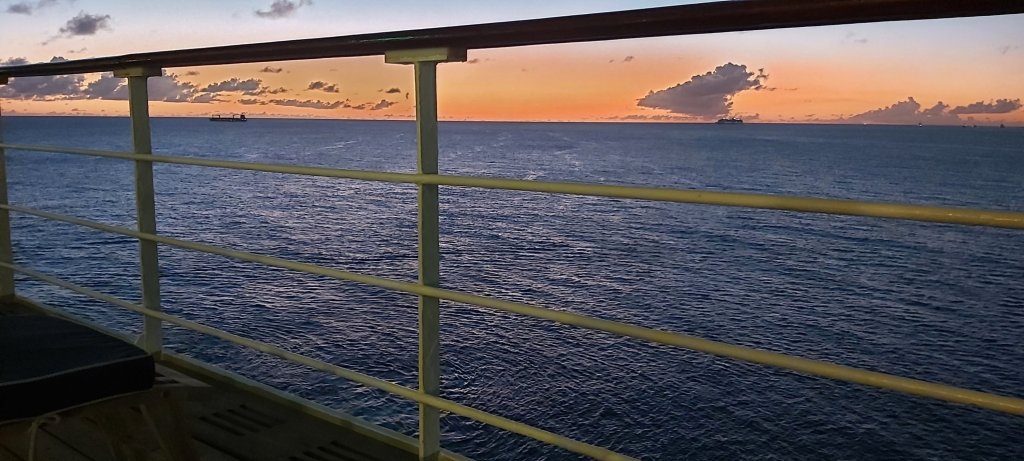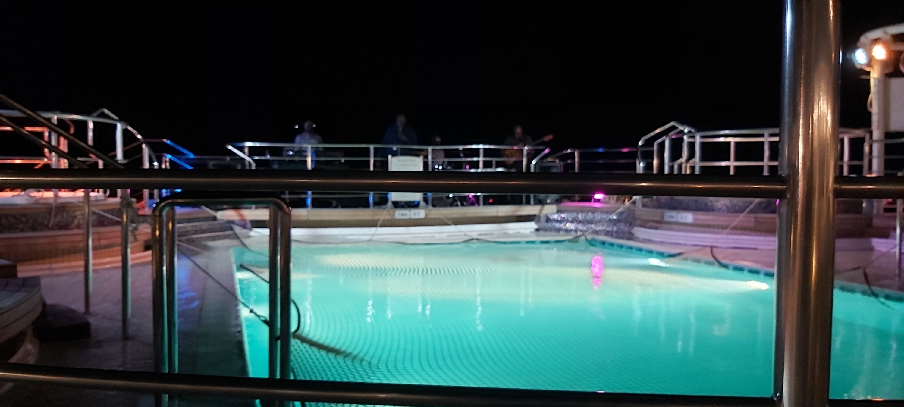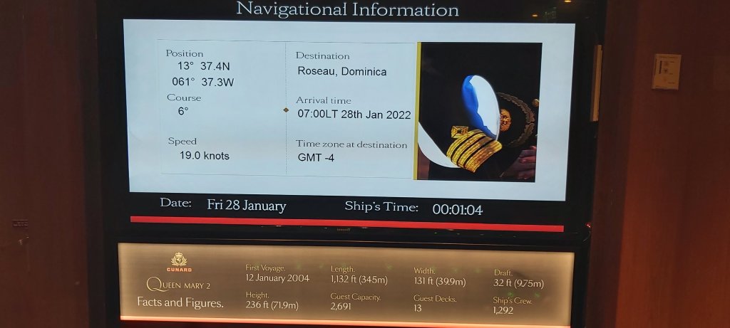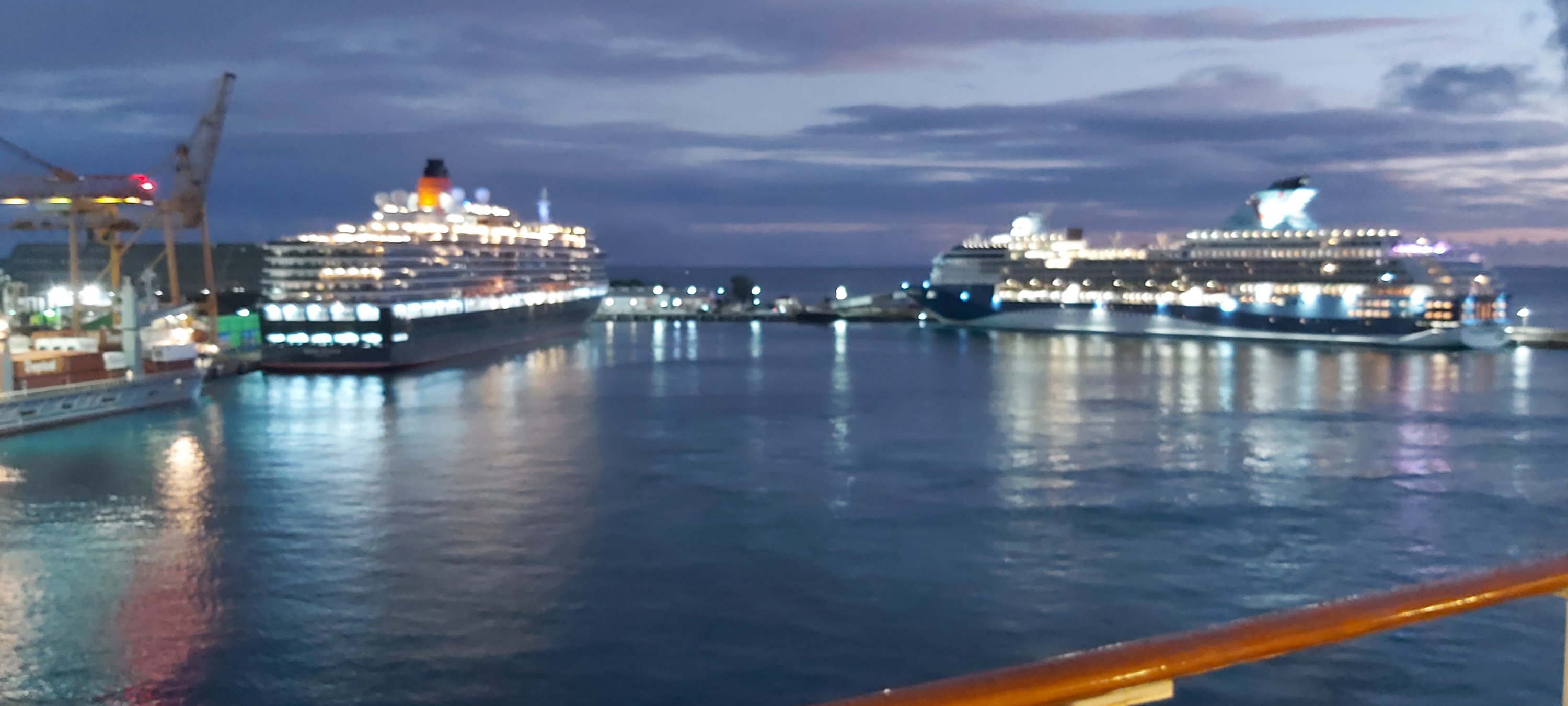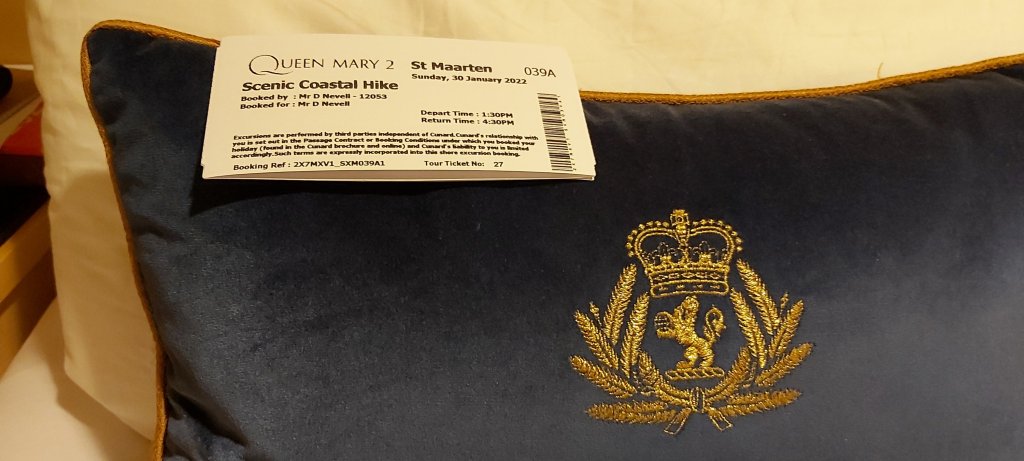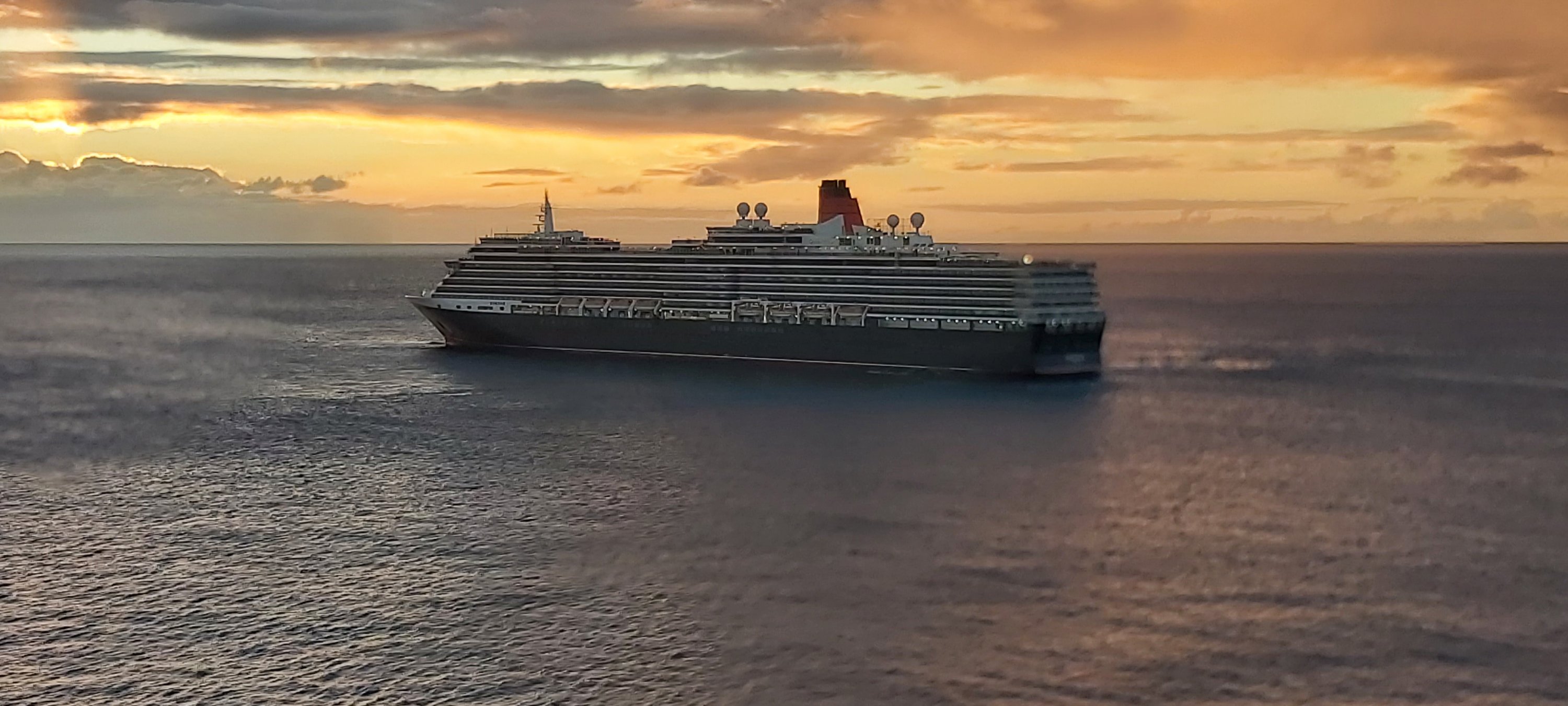 Yesterday felt like one I never wanted to end. Courtesy of Cunard, I enjoyed the challenging and extremely scenic hike along the coastal path. Being a Sunday, Philipsburg was not quite as vibrant as it might otherwise have been. But there was still that ambiance of joy with local music belting out from an al fresco bar only yards from the piers where MSC’s Seaview, and Cunard’s QM2 were berthed. Back on board at around 5 30pm, I just needed a cup of tea to chill out from the afternoon’s exertions. This was forthcoming in the King’s Court eatery, already being laid up for buffet dinner. The sun was setting rapidly and the usual magnificent Caribbean sunset soon exhibited its splendour and the sky appeared to be on fire. Soon, it was time to change for dinner, where Jack Joan, Jean and I were joined by a couple from Kent. At the show which followed in the Royal Court Theatre, the singer for the night Zoe Tyler, sang a bunch of (usually) well known songs with the passion of an artiste at the top of her game. Favourites of mine were her among her repertoire. I was not ready for slumber quite yet, and ventured to the pool area aft on Deck 8 where dancing under the stars was drawing to a close. The novelty of warm nights in January never wears off.