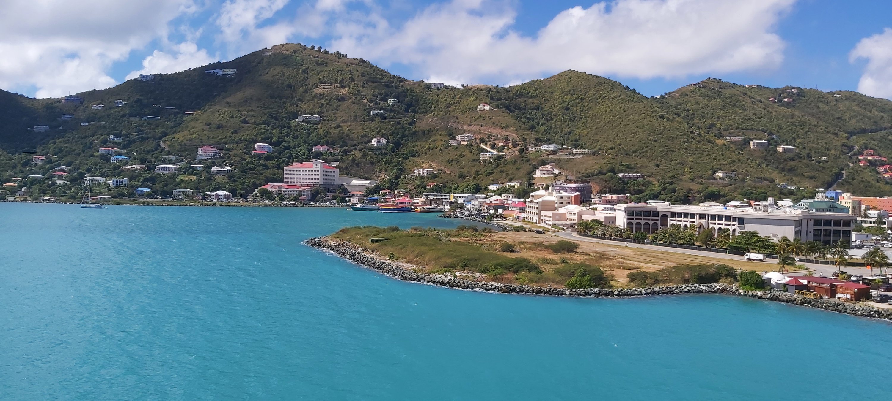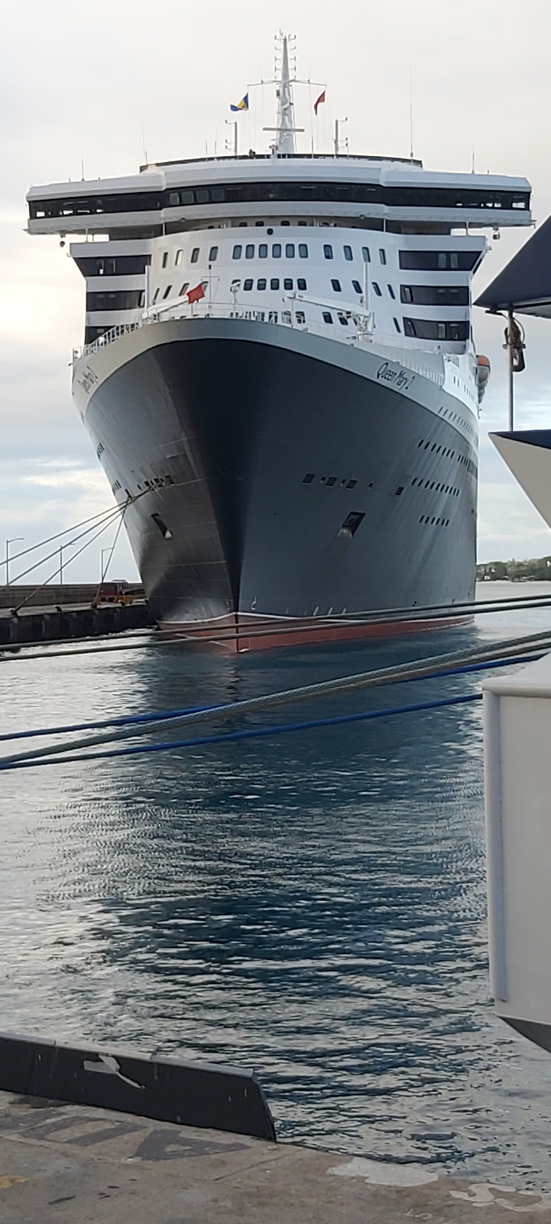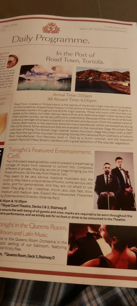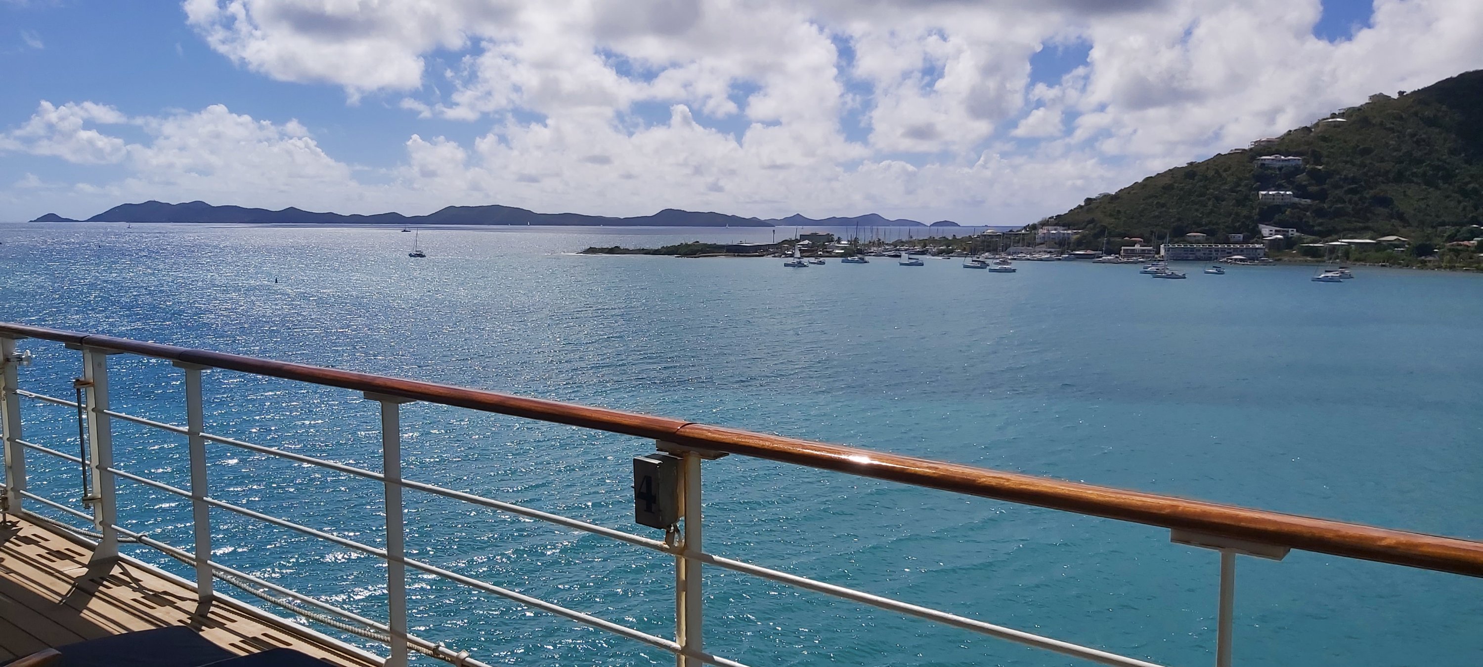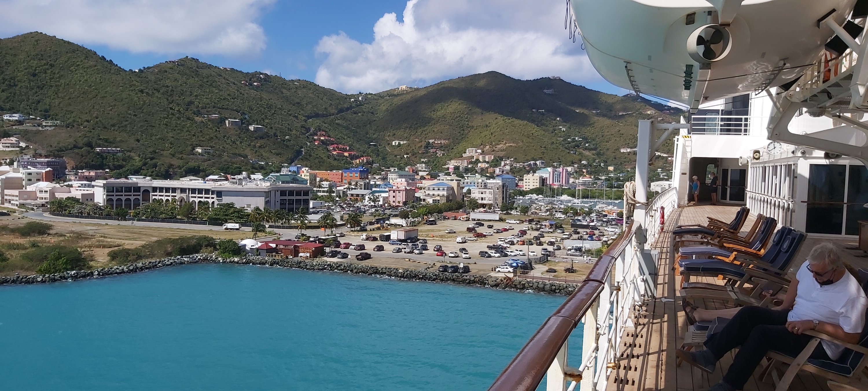 This morning, I awoke gently, and the News on the TV was its uninteresting predictable self. We are safely tied up at our final Caribbean destination, Road Town, Tortola. This afternoon, again, courtesy of Cunard, I get to tour this tiny island on a safari bus, which I understand are quite common on this Island.