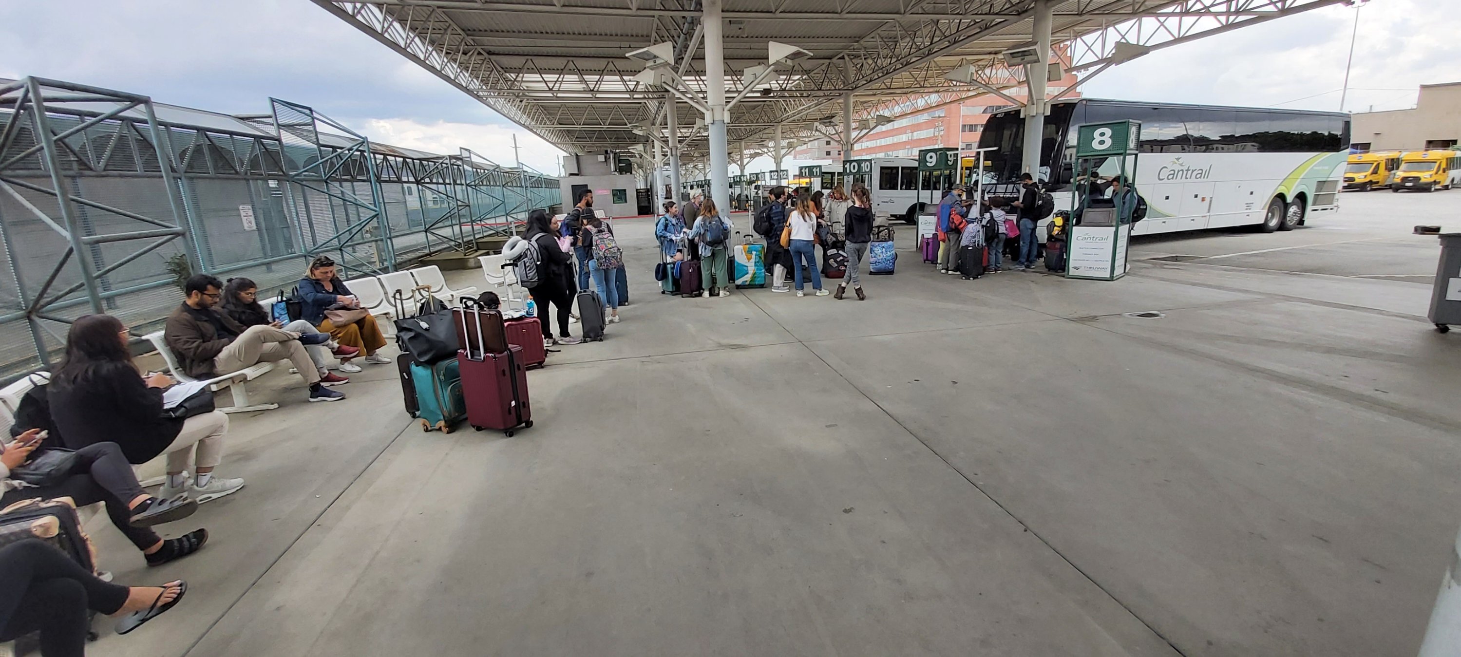 Inside Pacific Central Station, and the queue for the bus to Seattle.